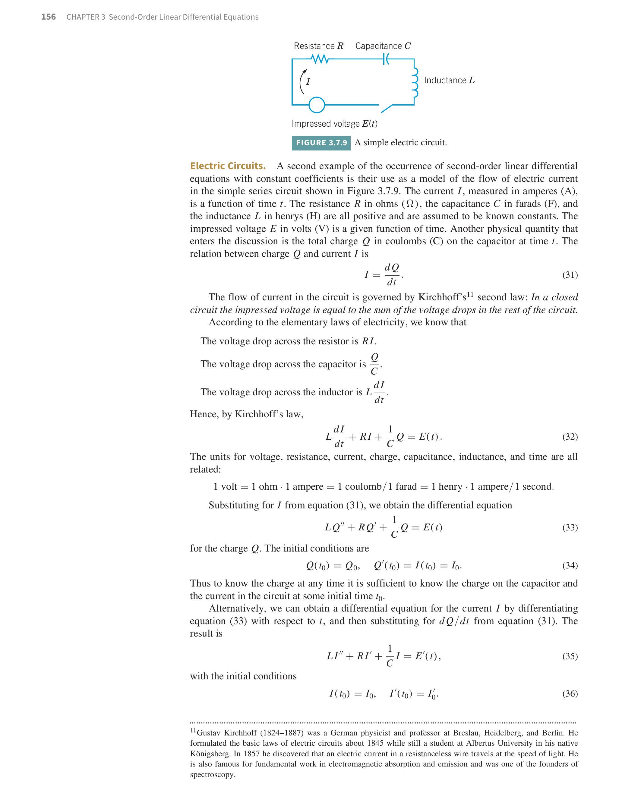 从本讨论中得出的最重要的结论是,电路中的电流流动可以通过与描述弹簧-质量系统运动的初值问题完全相同的形式来描述。这是数学统一作用的一个很好的例子:一旦你知道如何解二阶线性常系数方程,你就可以将结果解释为机械振动、电路,或任何导致相同问题的物理情境。