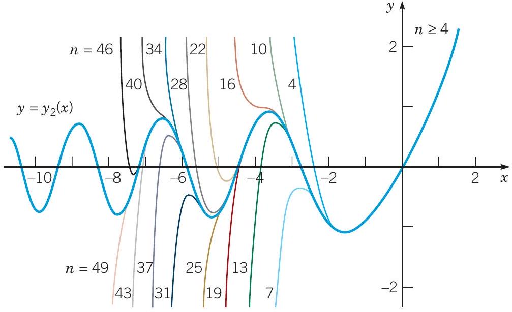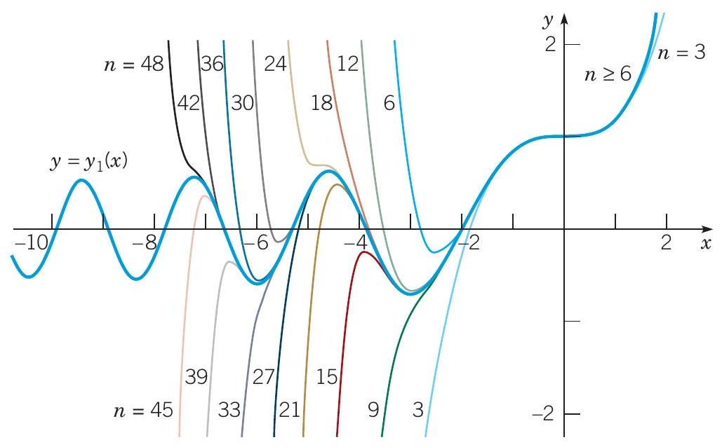 FIGURE 5.2.4 Airy方程的解 y=y2(x) 的多项式近似。n 的值是近似多项式的阶数。