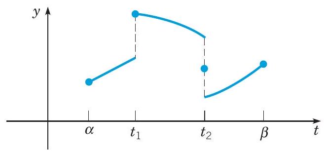 换句话说,如果 f 在 α≤t≤β 上是分段连续的,则除了有限数量的跳跃不连续点之外,它在那里是连续的。如果 f 在 α≤t≤β 上对于每个 β>α 都是分段连续的,则称 f 在 t≥α 上是分段连续的。图 6.1.1 显示了一个分段连续函数的示例。