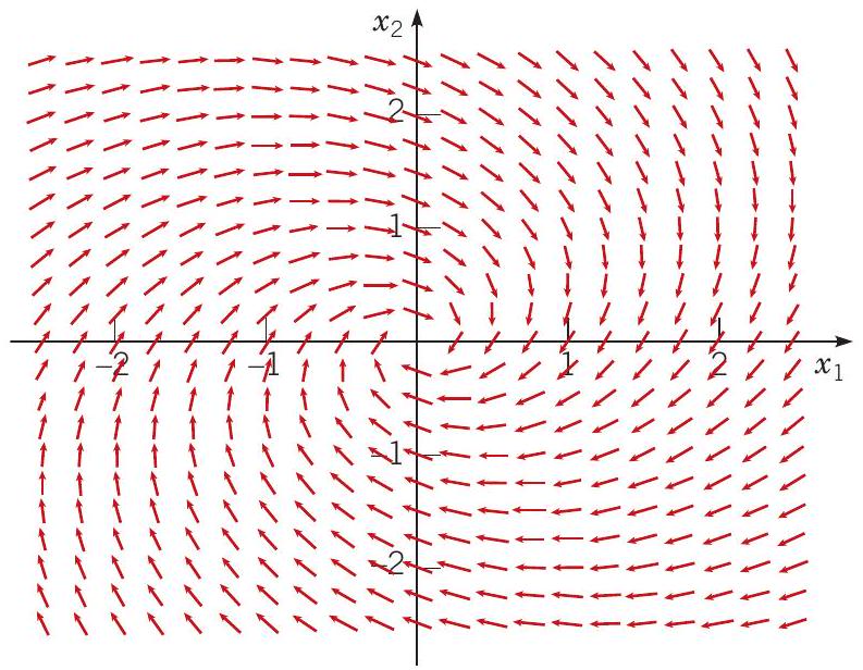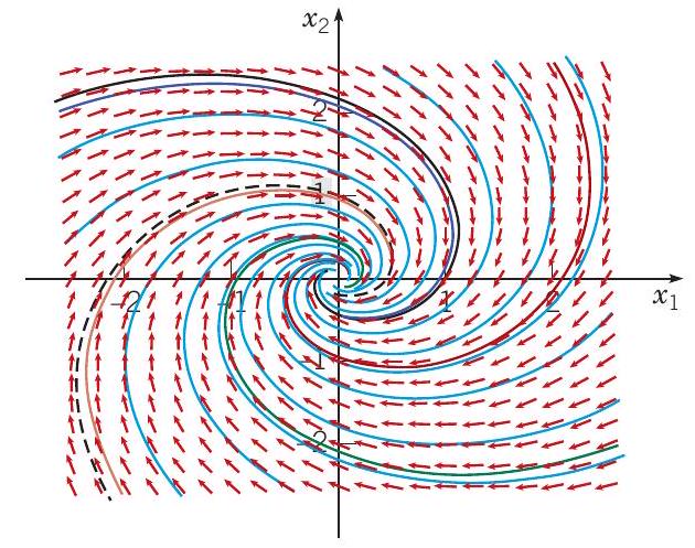 系统 (4) 的方向场如图 7.6.1 所示。 该图表明相平面中的轨迹顺时针螺旋向原点。