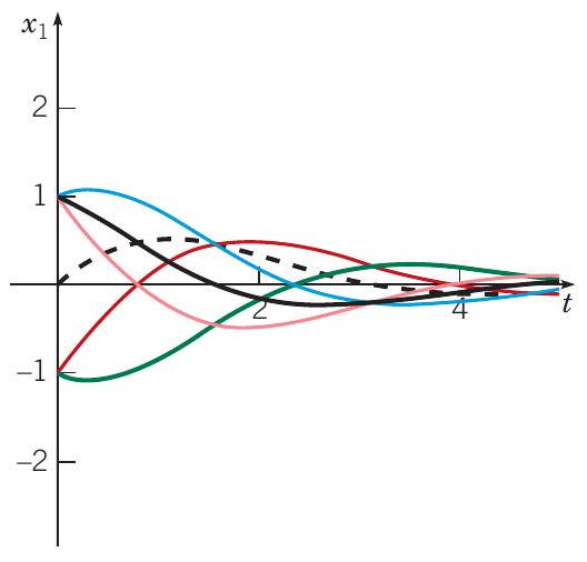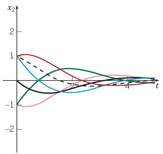 u(t) 和 v(t) 的图像分别通过点 (1,0) 和 (0,1)。系统 (4) 的其他解是 u(t) 和 v(t) 的线性组合,并且图 7.6.2(a) 中也显示了其中一些解的图像。当 t→∞ 时,每个轨迹都沿着螺旋路径接近原点,围绕原点进行无限多次旋转;这是由于解 (11) 是衰减指数和正弦或余弦因子的乘积。图 7.6.2(b) 显示了一些 x1 相对于 t 的典型图像;每一个都代表着随时间衰减的振荡。图 7.6.2(c) 显示了相应的 x2 相对于 t 的图像。