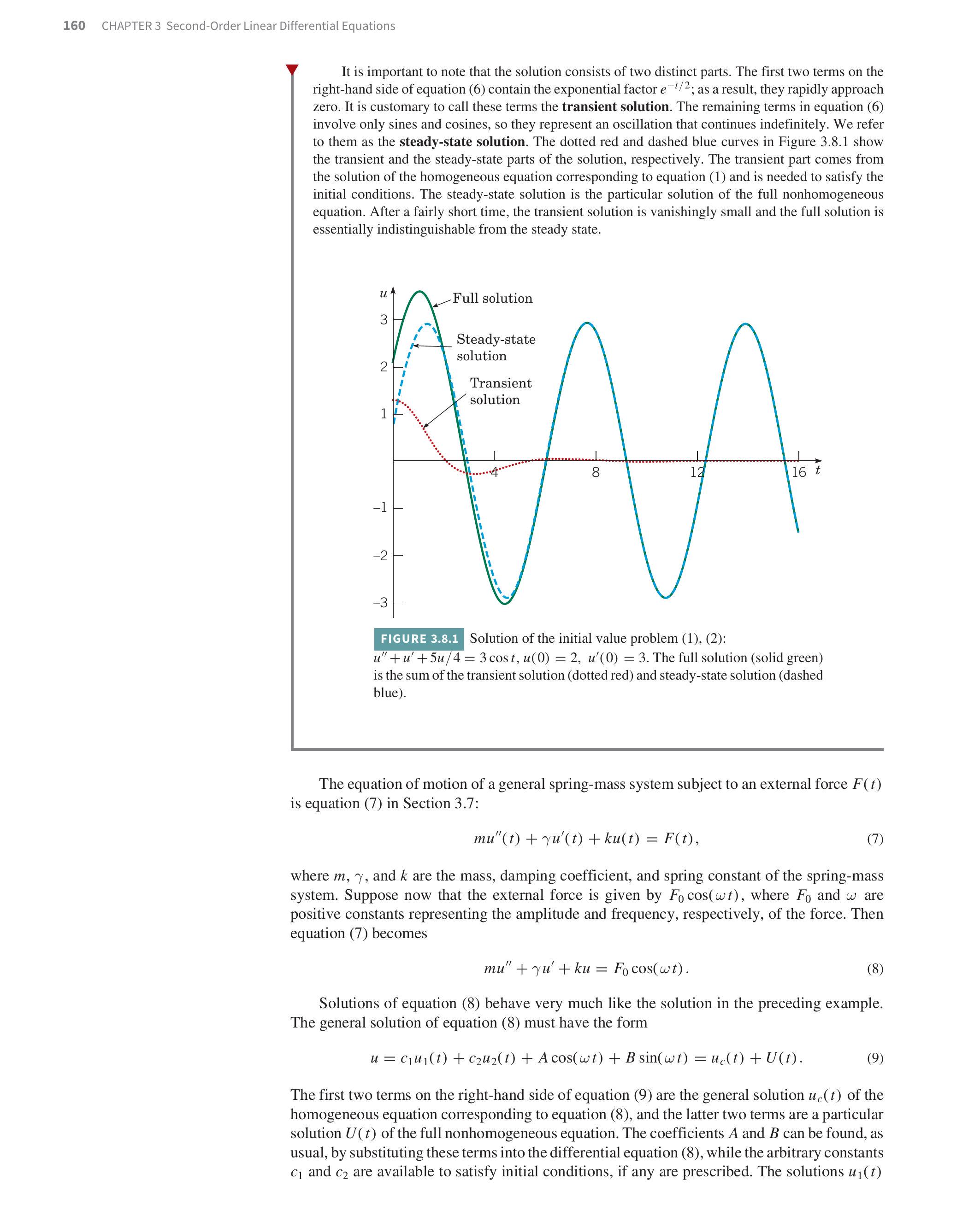 It is particularly interesting to suppose that the mass is initially at rest so that the initial conditions are u(0)=0u(0)=0 and u^(')(0)=0u^{\prime}(0)=0. Then the energy driving the system comes entirely from the external force, with no contribution from the initial conditions. In this case it turns out that the constants c_(1)c_{1} and c_(2)c_{2} in equation (18) are given by