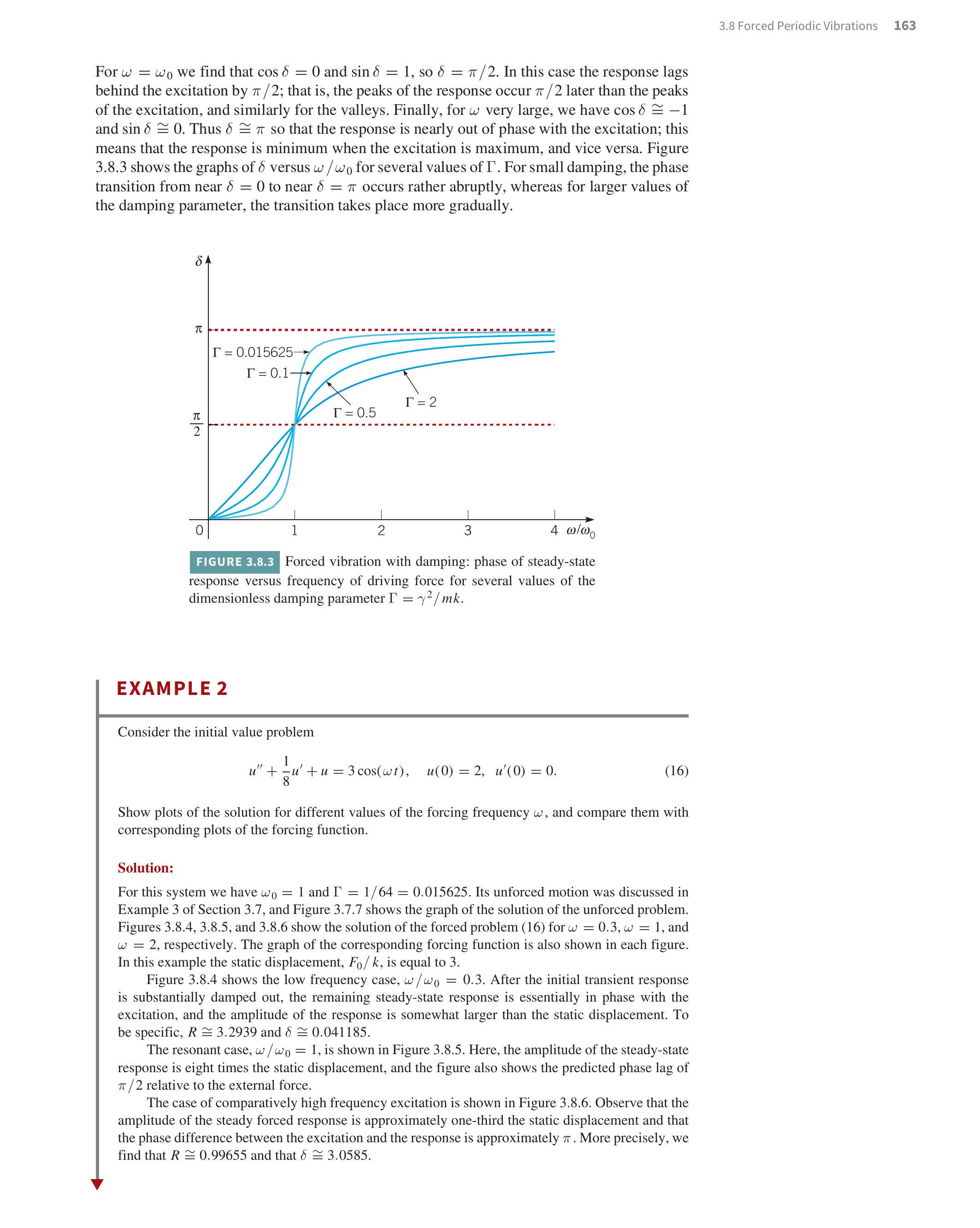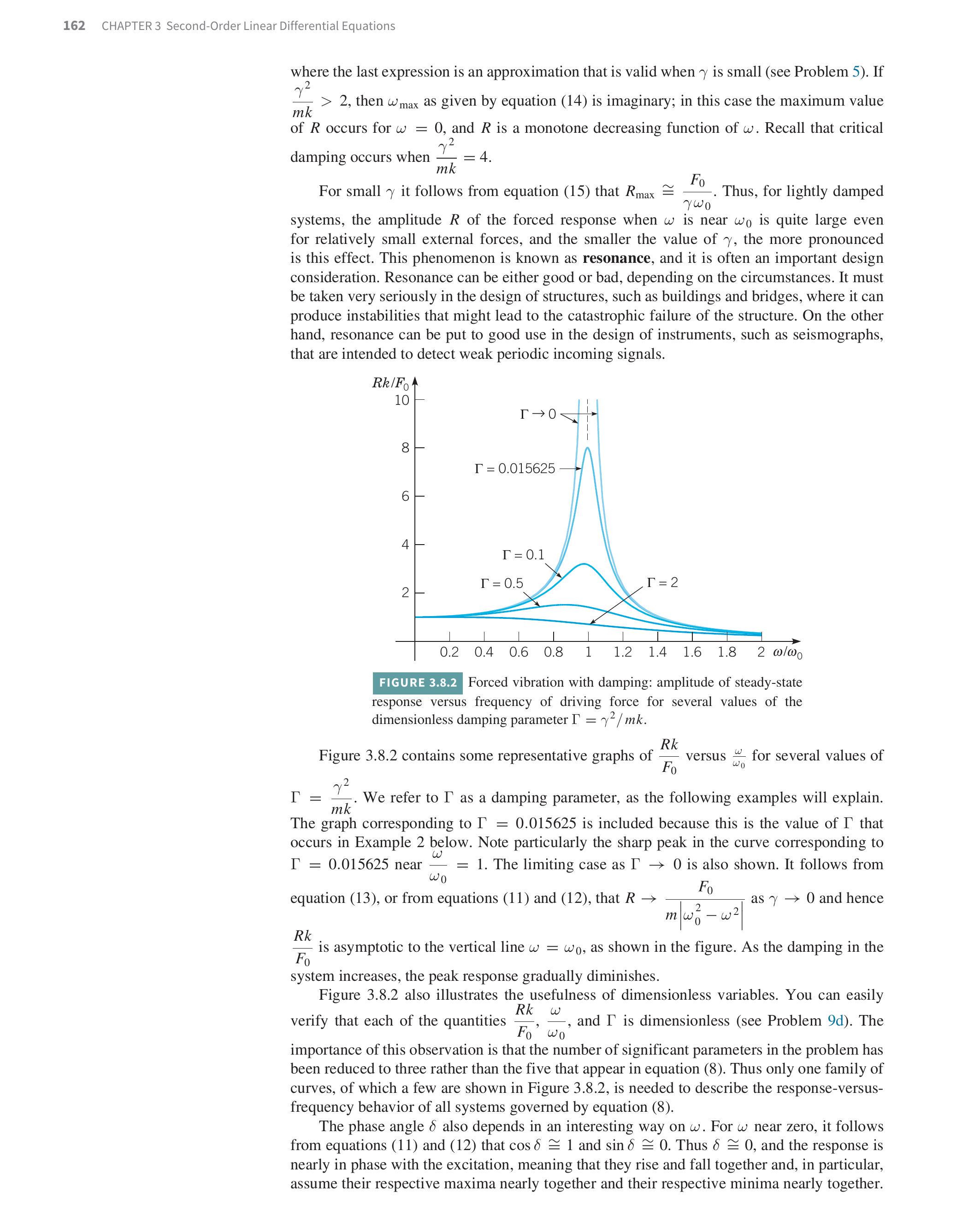 Figure 3.8.2 contains some representative graphs of (Rk)/(F_(0))\frac{R k}{F_{0}} versus (omega)/(omega_(0))\frac{\omega}{\omega_{0}} for several values of Gamma=(gamma^(2))/(mk)\Gamma=\frac{\gamma^{2}}{m k}. We refer to Gamma\Gamma as a damping parameter, as the following examples will explain. The graph corresponding to Gamma=0.015625\Gamma=0.015625 is included because this is the value of Gamma\Gamma that occurs in Example 2 below. Note particularly the sharp peak in the curve corresponding to Gamma=0.015625\Gamma=0.015625 near (omega)/(omega_(0))=1\frac{\omega}{\omega_{0}}=1. The limiting case as Gamma rarr0\Gamma \rightarrow 0 is also shown. It follows from equation (13), or from equations (11) and (12), that R rarr(F_(0))/(m|omega_(0)^(2)-omega^(2)|)R \rightarrow \frac{F_{0}}{m\left|\omega_{0}^{2}-\omega^{2}\right|} as gamma rarr0\gamma \rightarrow 0 and hence (Rk)/(F_(0))\frac{R k}{F_{0}} is asymptotic to the vertical line omega=omega_(0)\omega=\omega_{0}, as shown in the figure. As the damping in the system increases, the peak response gradually diminishes.