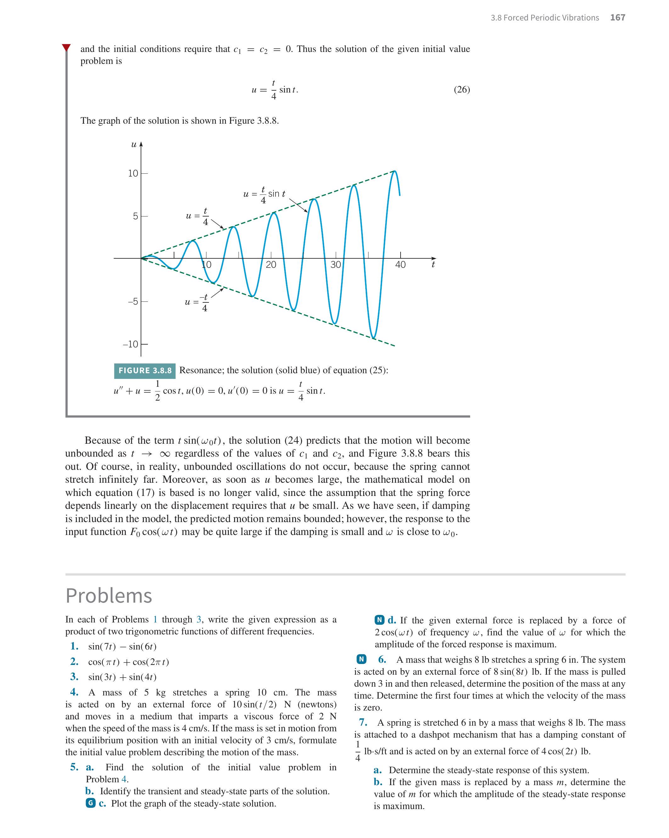 Because of the term t sin(omega_(0)t)t \sin \left(\omega_{0} t\right), the solution (24) predicts that the motion will become unbounded as t rarr oot \rightarrow \infty regardless of the values of c_(1)c_{1} and c_(2)c_{2}, and Figure 3.8.8 bears this out. Of course, in reality, unbounded oscillations do not occur, because the spring cannot stretch infinitely far. Moreover, as soon as uu becomes large, the mathematical model on which equation (17) is based is no longer valid, since the assumption that the spring force depends linearly on the displacement requires that uu be small. As we have seen, if damping is included in the model, the predicted motion remains bounded; however, the response to the input function F_(0)cos(omega t)F_{0} \cos (\omega t) may be quite large if the damping is small and omega\omega is close to omega_(0)\omega_{0}.