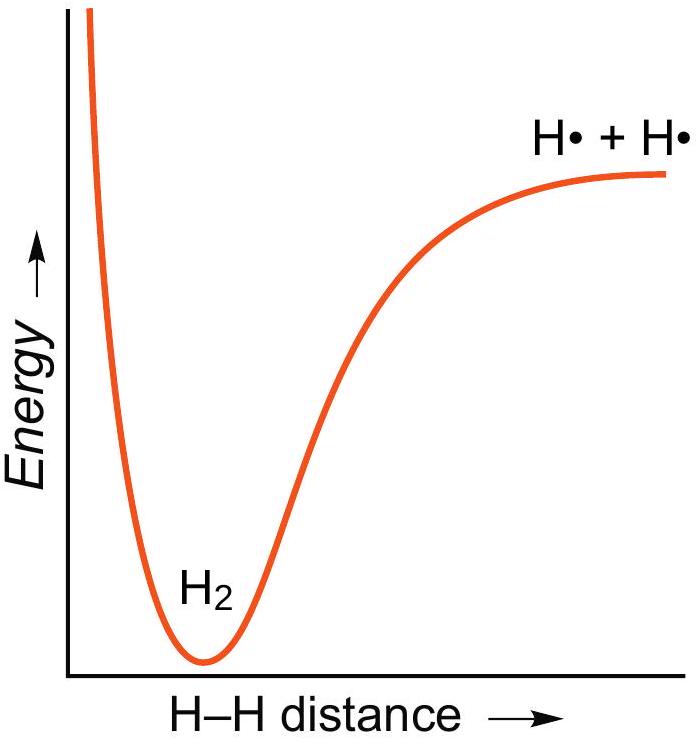 共价键是一种量子现象——它没有经典类比。考虑H₂中的H-H键。当两个H原子相互靠近,它们的1s轨道重叠时,就形成了键。这意味着当原子核靠近(但不过于靠近)时,能量会更低,如右侧图所示。这种能量的降低就是键。H-H键并非连接H原子的独立物理实体,它仅仅是能量-距离曲线右侧的低能量区域。