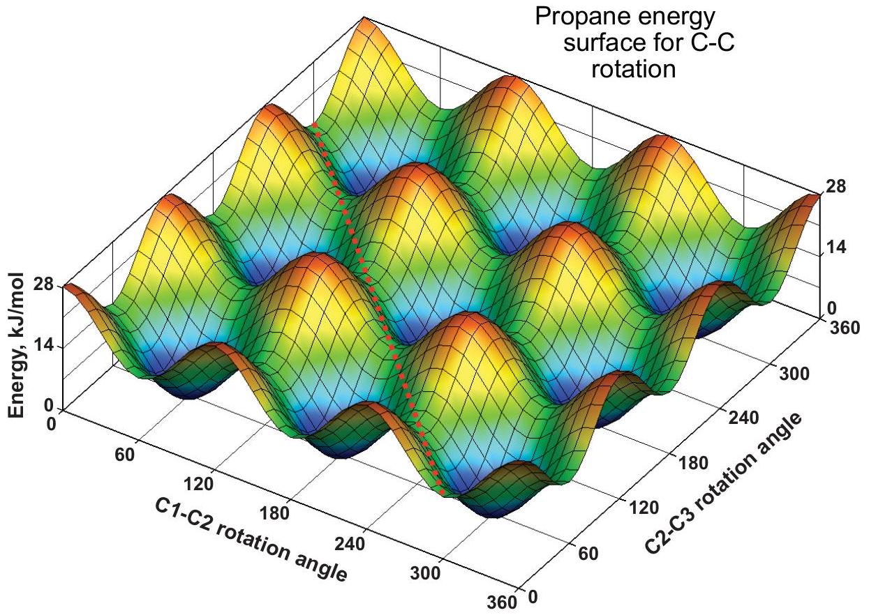 有两个 C-C 旋转,每个旋转的势垒为 。每个旋转角度都可以取任意值,因此会形成一个能量面,被称为“蛋盒表面”(egg-carton surface)。在红色峰值处, 和 的旋转都是重叠的;在蓝色谷底处,两者都是交错的。在其他网格点,一个是交错,一个是重叠。上方的 1D 曲线可以通过选择任一网格线并沿其从 到 的方向追踪(保持另一个角度不变)来得到。例如,沿 轴线()的能量在 14 和 28 之间振荡;而在相邻的网格线()上,能量在 0 和 14 之间变化。