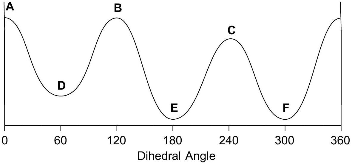 画出 3 个重叠 和 3 个交错 的 Newman 投影,标记为 A 到 F,注明二面角。