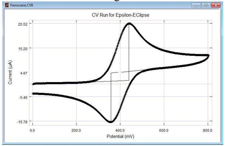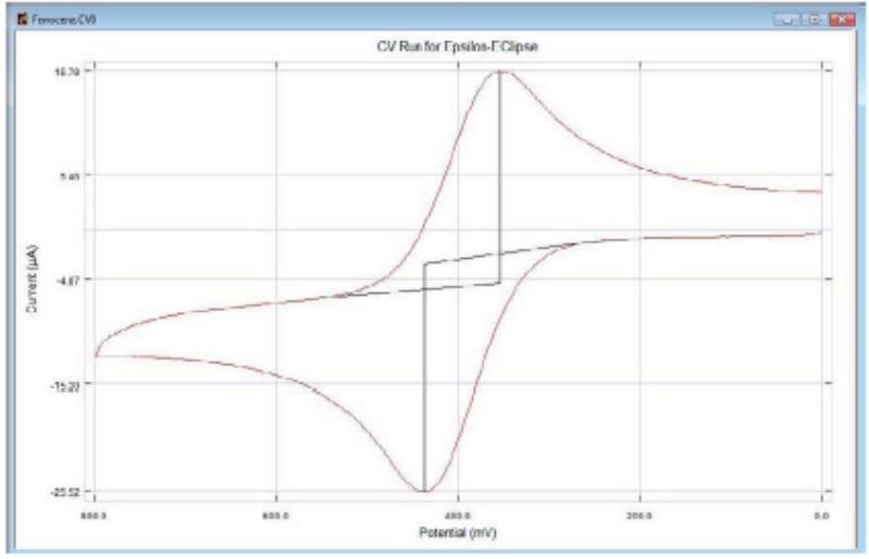 - 在此窗口内,以 10,20,30,500,100,150mV/s 的扫描速率记录伏安图。伏安图应与下图相似: