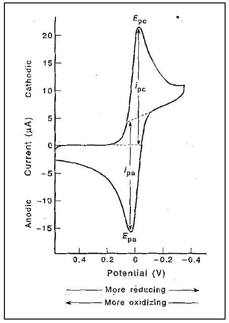 当电位扫回至更低电压时(称为阴极方向),在第一次扫描中生成的 Fe(C5H5)2+ 阳离子被还原回 Fe(C5H5)2。在此氧化还原过程的初始和最终电位扫描中,峰电流几乎相同,因此该氧化还原过程是可逆的。由于 Fe(C5H5)20 和 Fe(C5H5)2+ 在扫描期间都是稳定的,因此应该可以通过添加化学氧化剂来氧化 Fe(C5H5)20。该过程的 E1/2 表明 Fe(C5H5)20 可以被氯 (E1/2=1.36 V) 氧化,但不能被碘 (E1/2=0.535 V) 氧化。
