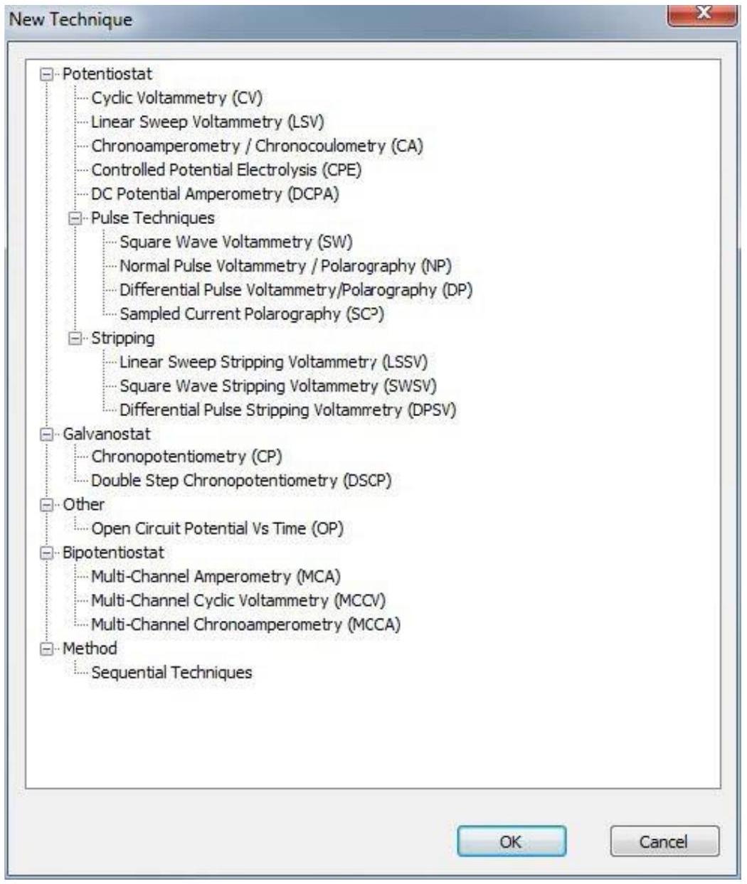 创建新的技术文件:在软件主界面,点击菜单栏的 File,然后选择 New。在弹出的 “Select New Technique” 对话框中(如手册图 1),从列表中高亮选中 Cyclic Voltammetry,然后点击 OK。
