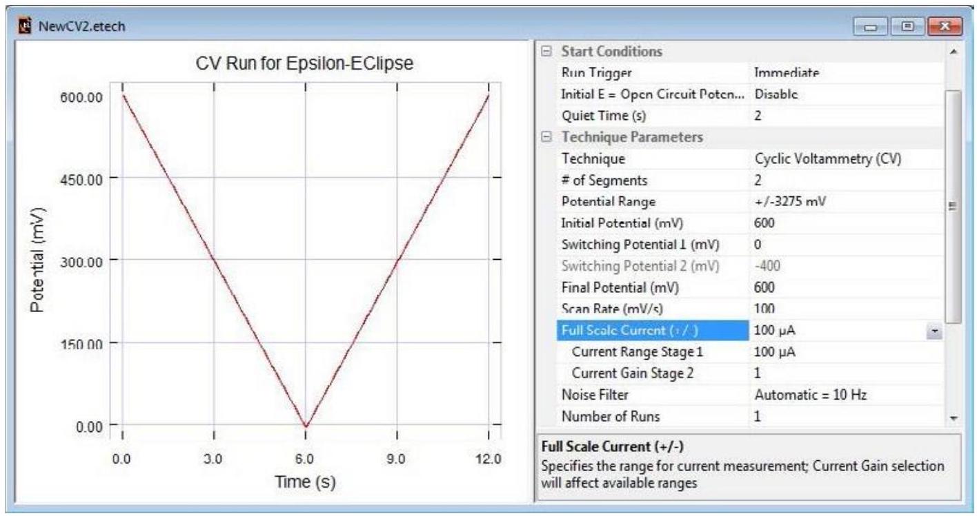 当前会看到的状态:技术参数窗口右侧的所有字段都已填妥。在参数窗口的左侧,您会看到一个小的预览图,动态展示了您所设定的电位-时间波形(一个从0V到600mV再返回的三角形),这有助于直观地确认参数设置的正确性。