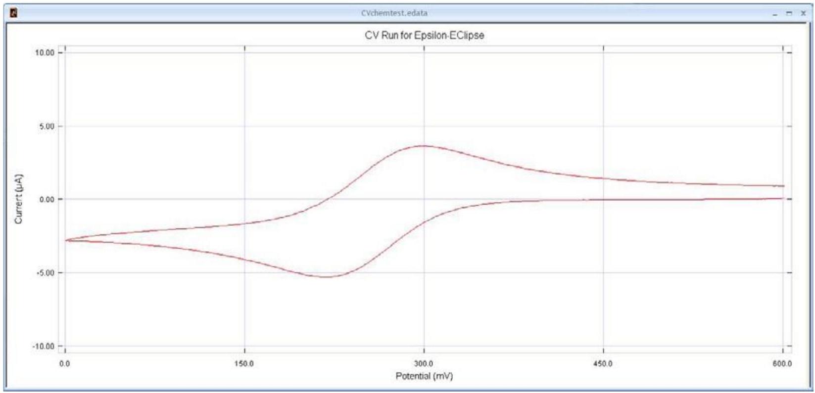 实时观察:一个标题为 CVData0.edata 的新窗口会弹出,并开始实时绘制伏安图。由于扫描速率很慢(10 mV/s),整个过程将持续 (600 mV / 10 mV/s) * 2 = 120 秒。您将有充足的时间观察电位扫描时电流的响应:先是阳极峰的缓慢形成,然后在 600 mV 处反转,接着是阴极峰的出现。