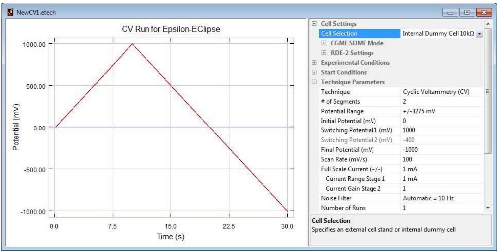 切换至内部模拟电解池:在新打开的技术参数窗口(*.etech 文件)的右侧参数面板中,找到 Cell Settings 区域。点击 Cell Selection 旁边的下拉菜单,从选项中选择 Internal Dummy Cell 10k Ω。