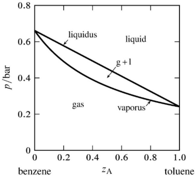 - 坐标轴: 纵轴是总压力 (P),横轴是体系的总组成,用甲苯的摩尔分数 zA 表示。