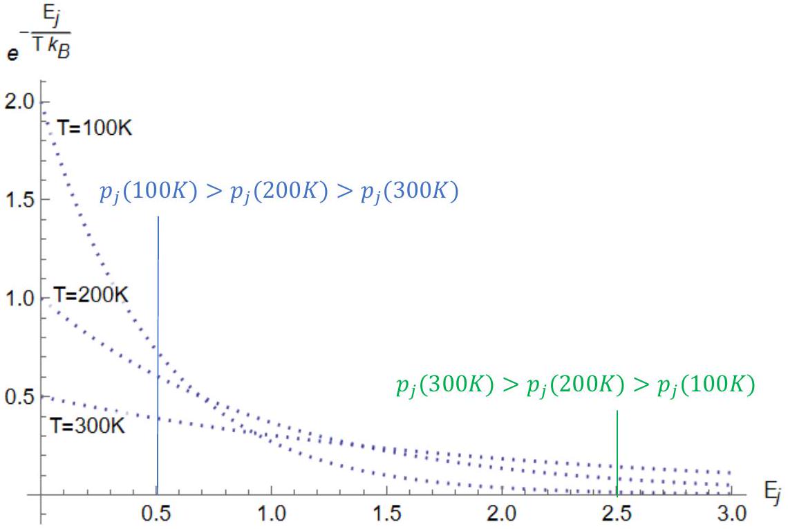 对于问题的第二部分,比较在 Ej=0.5 处三个温度的 pj∝e−kBTEj。我们看到 pj(100K)>pj(200K)>pj(300K)。这意味着这个特定的状态 (Ej=0.5) 在较低温度下被占据的可能性更大。在较高能态 Ej=2.5 处,趋势则相反,这意味着较高能态在较高温度下更有可能被占据。这应该很直观。