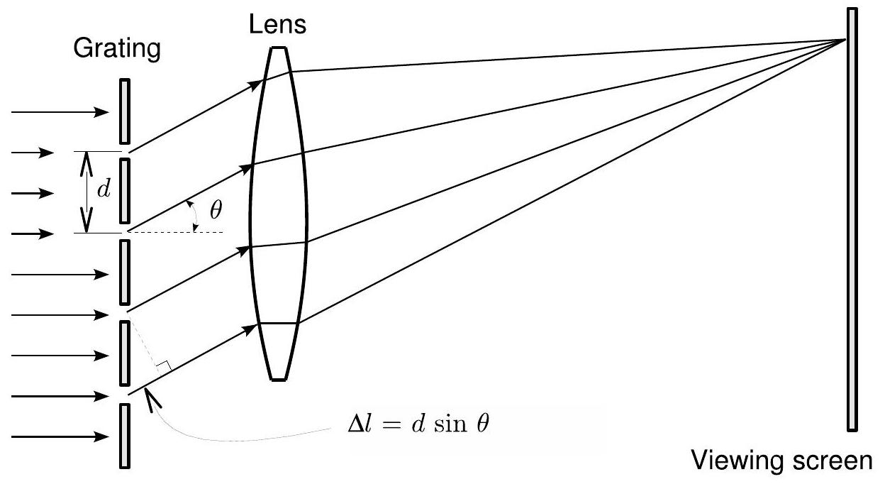 at the slits, but depending on the angle with which they leave the grating (called the diffraction angle ), they travel different paths to the viewing screen and may be out of phase by that point. From the figure, the difference in the path length for two adjacent slits is