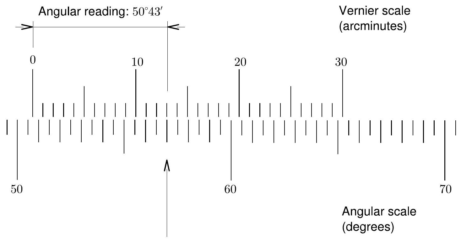 Scan down from the Vernier scale to the next line on the degree scale, as read from the left. This line is the angle , accurate to the nearest half degree ( ).