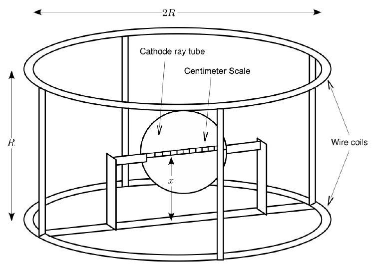 管的设置使电子束垂直于均匀磁场 传播,初始方向为垂直向上。 场由通过一对大直径线圈(即所谓的"亥姆霍兹线圈")的电流 产生,这种设计可在中心区域产生最佳的场均匀性。