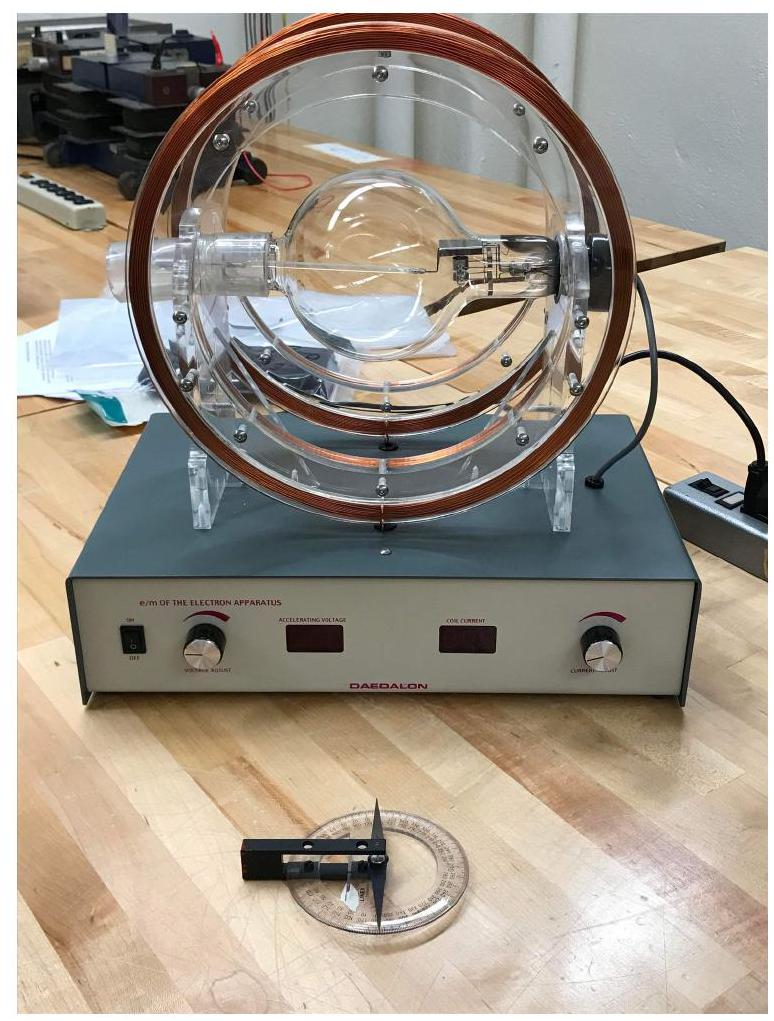 An example is shown in Fig. 8.4 Please exercise caution as you align the Helmholtz coils: the cathode ray tube is very delicate and may break if a large force is applied to it. It is recommended that you never touch the tube or the coils, and only maneuver the setup by touching the base.