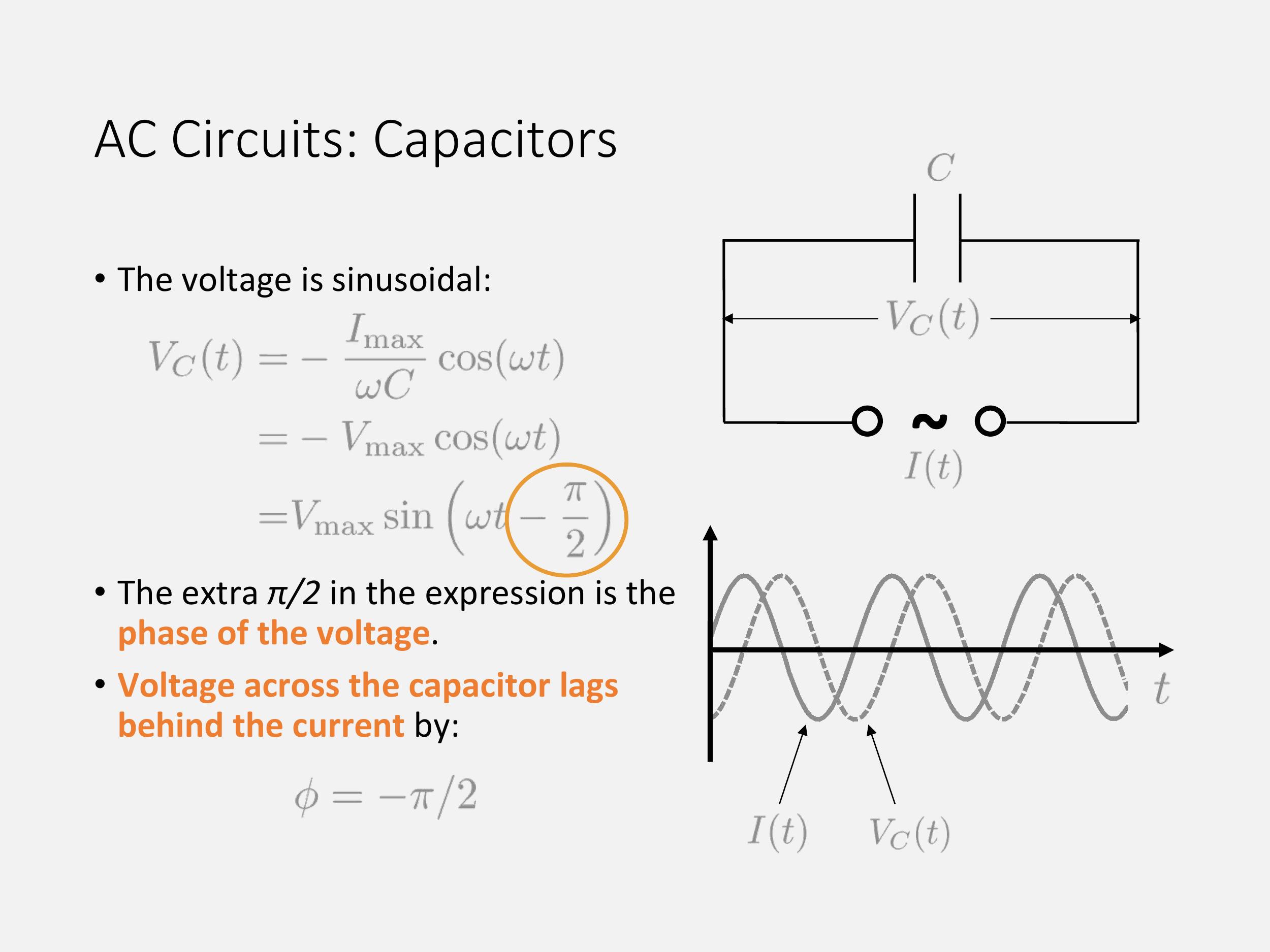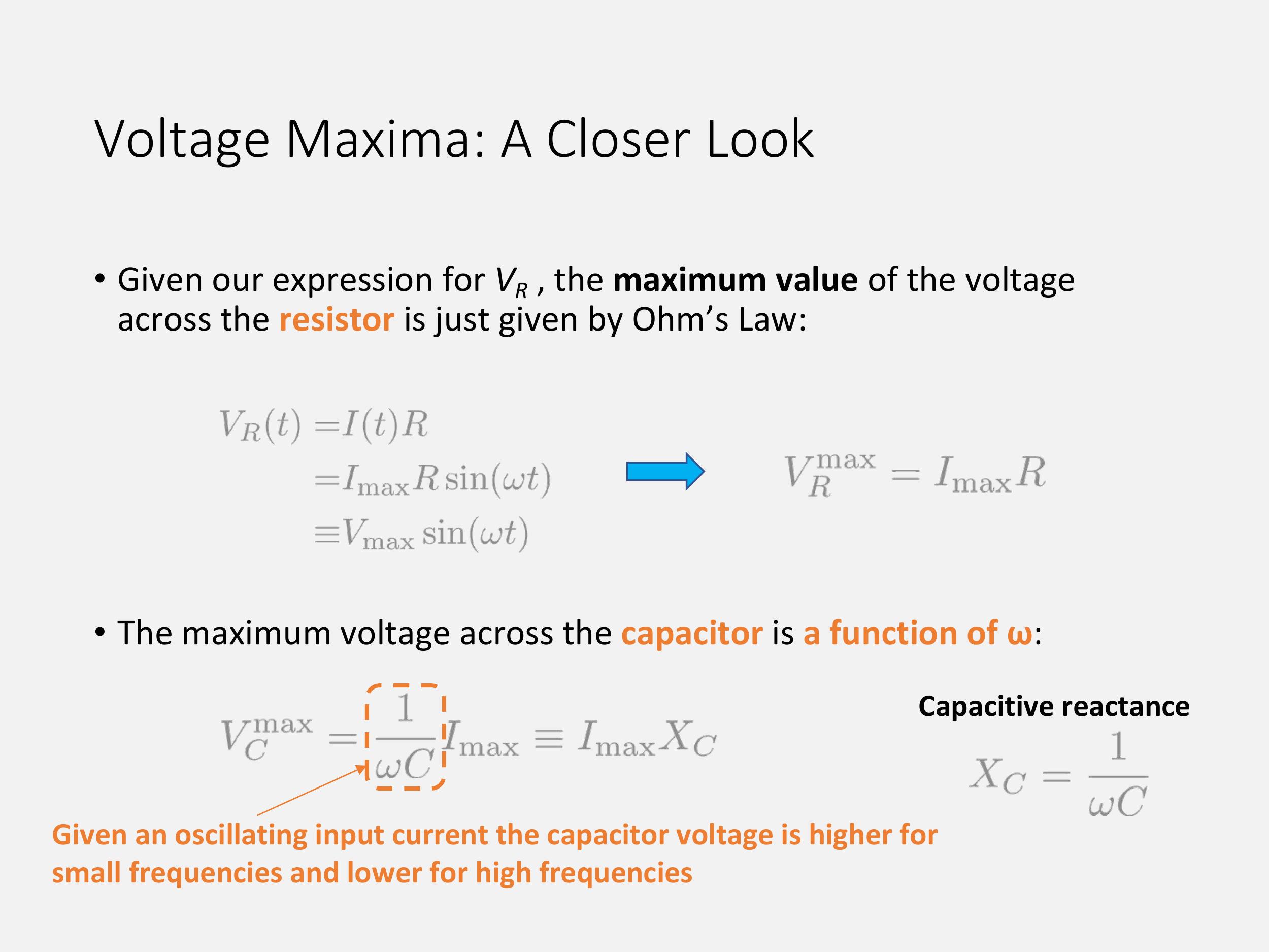 Now that we have introduced the language of reactances, you can think about the capacitor somehow as a resistor with omega\omega-dependent resistance