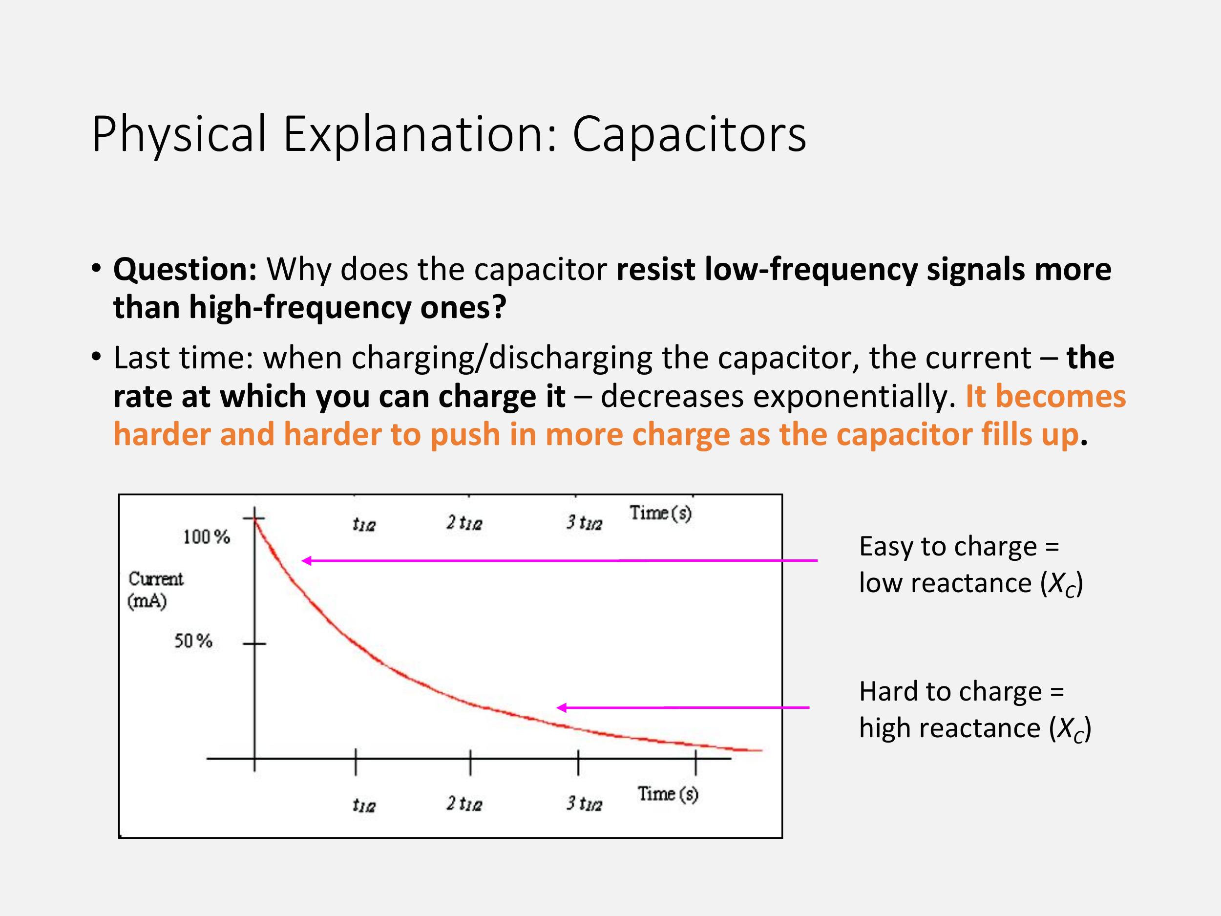 Last time: when charging/discharging the capacitor, the current - the rate at which you can charge it - decreases exponentially. It becomes harder and harder to push in more charge as the capacitor fills up.