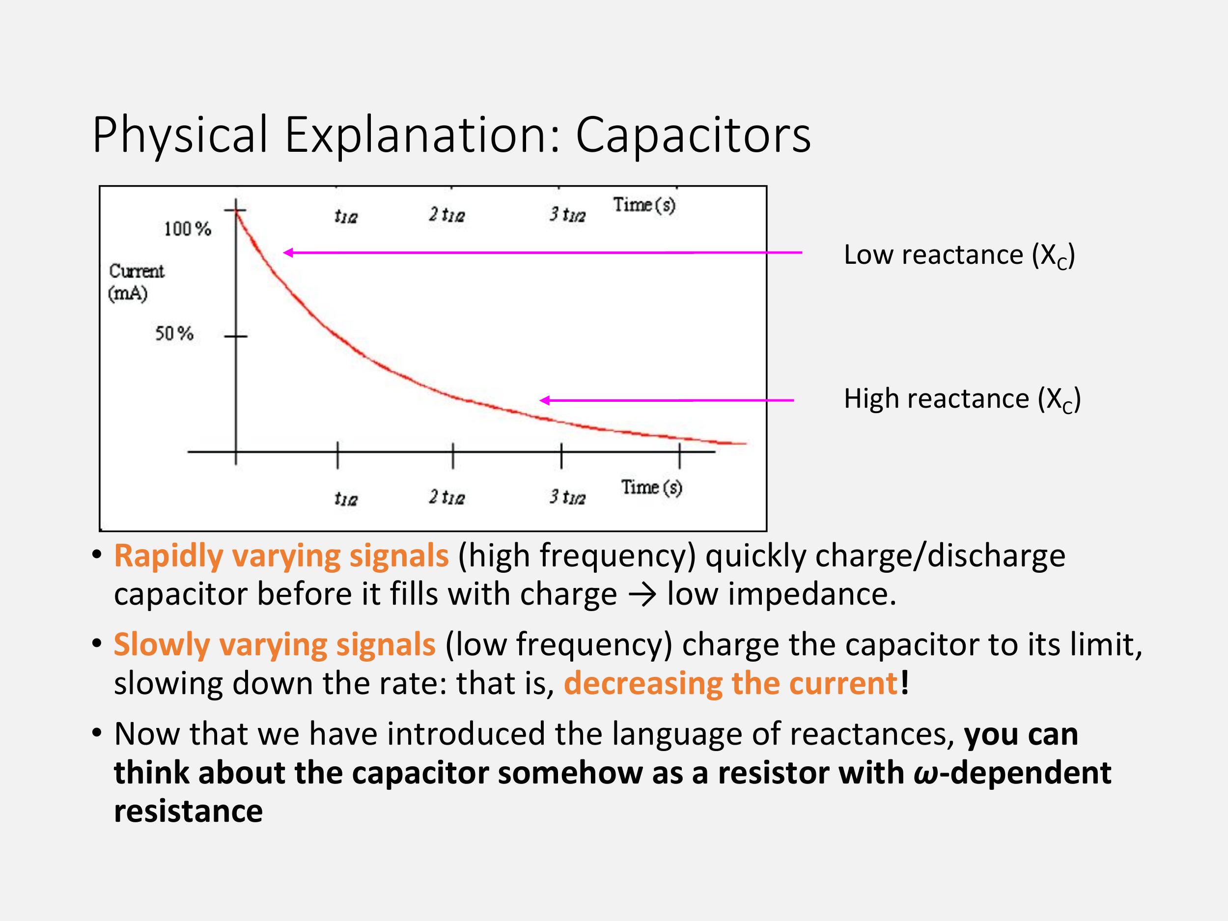 Hard to charge = high reactance (X_(C))\left(X_{C}\right)