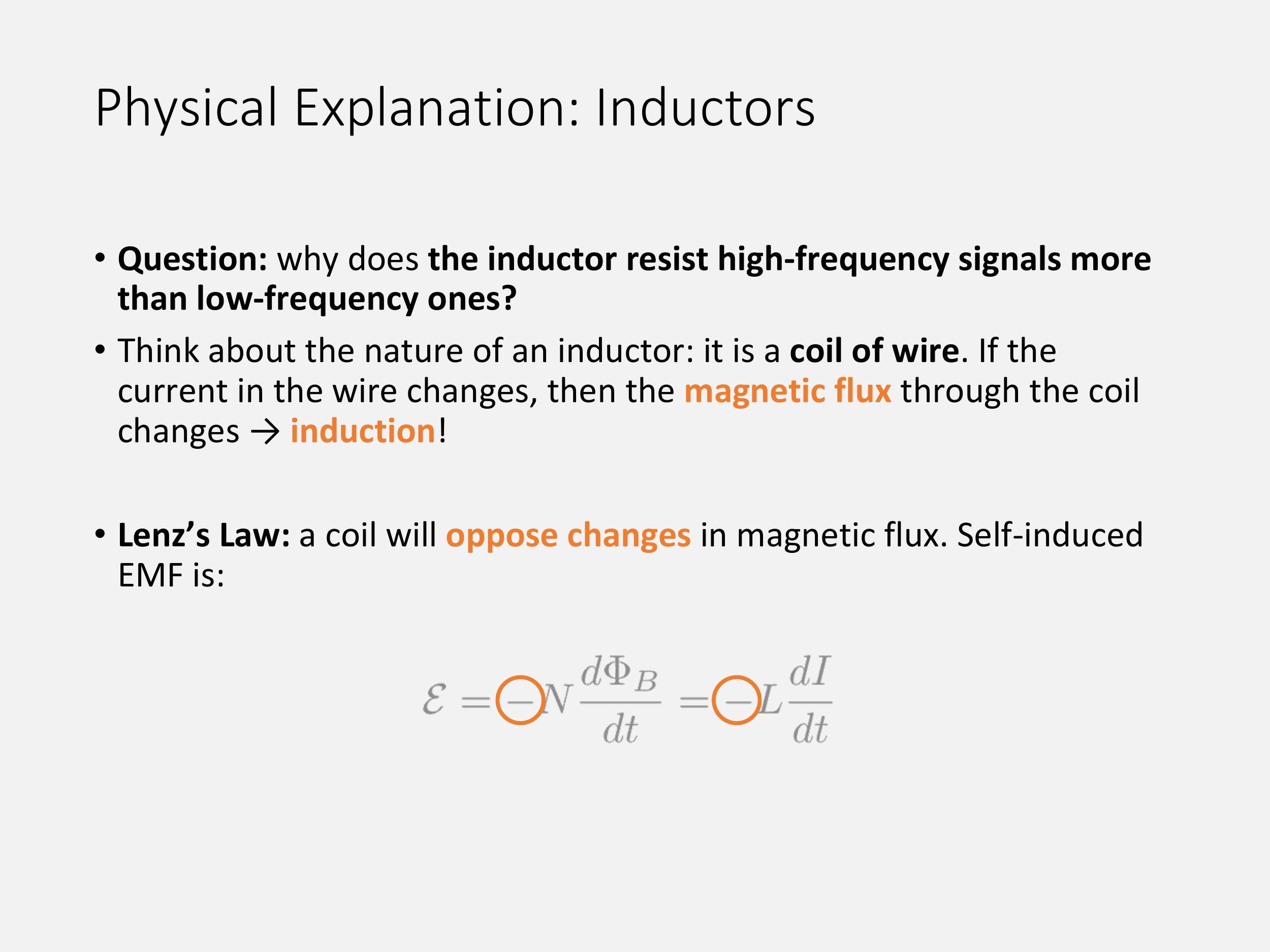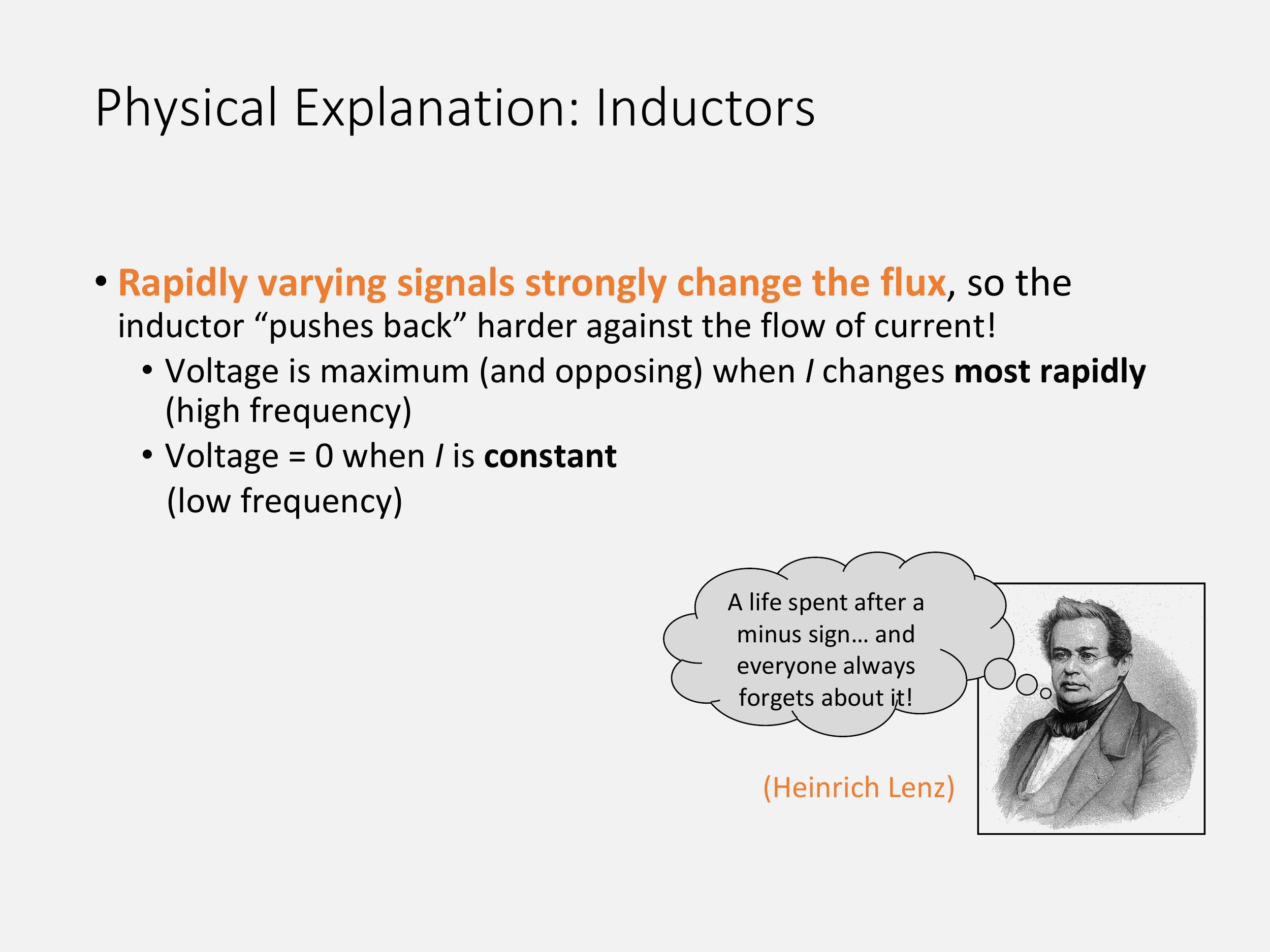 Rapidly varying signals strongly change the flux, so the inductor "pushes back" harder against the flow of current!