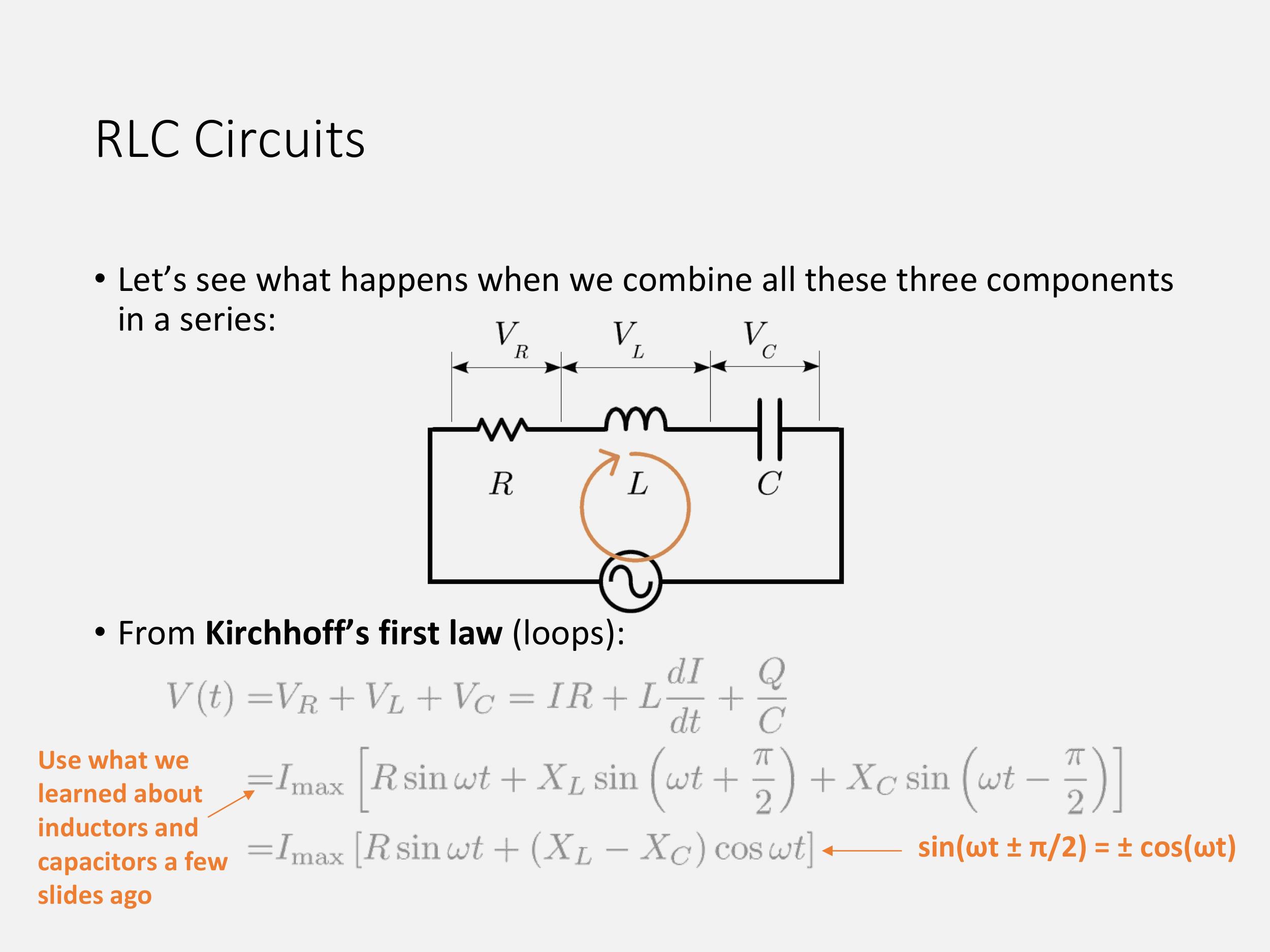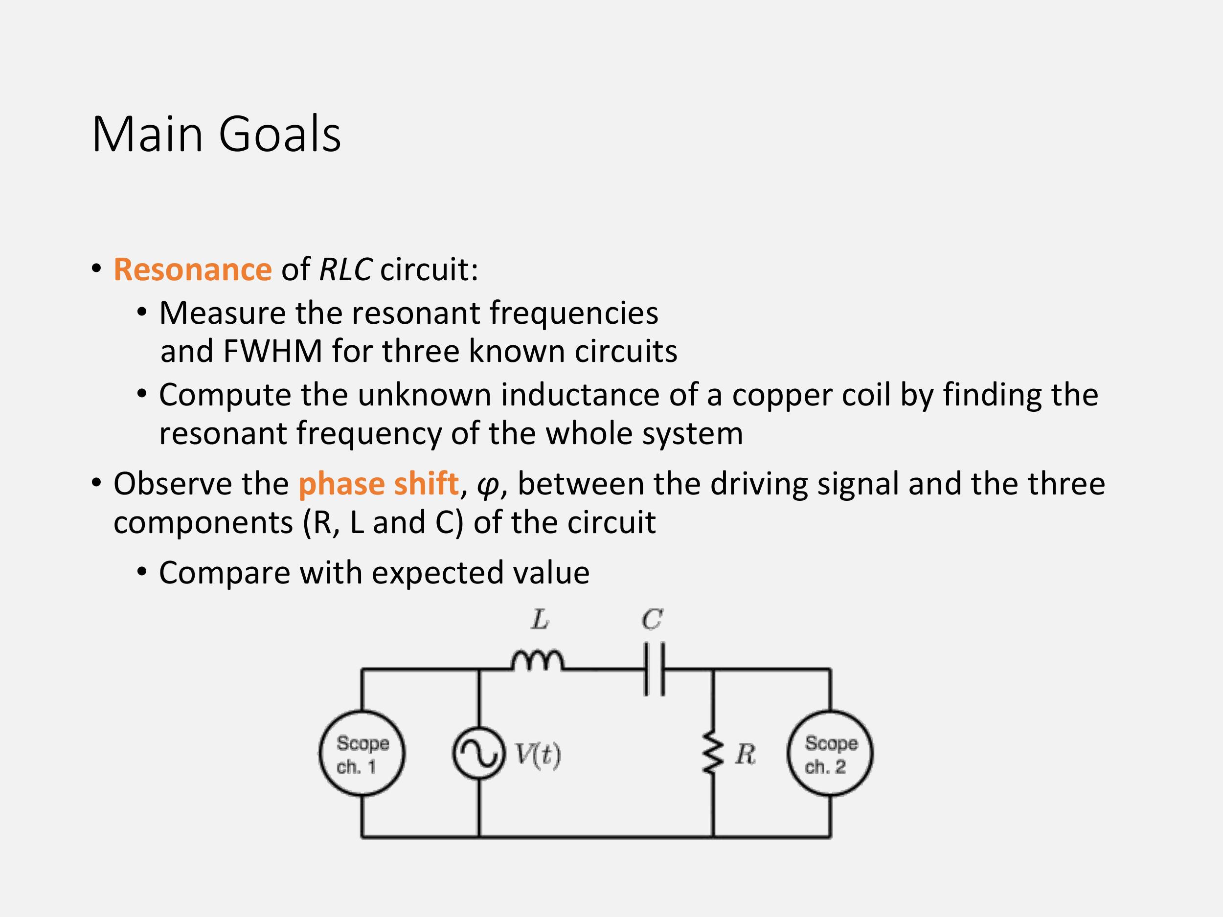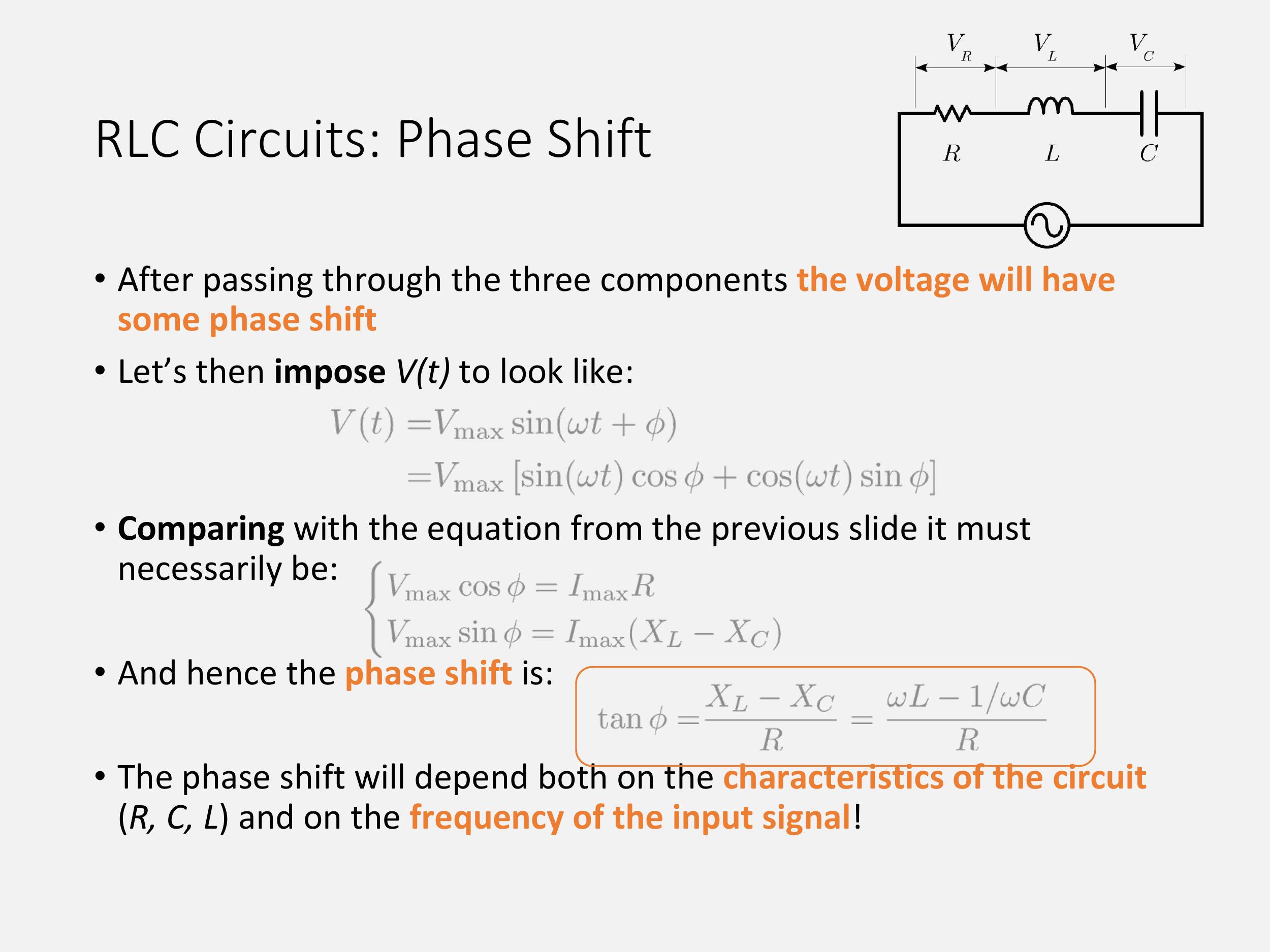 Observe the phase shift, varphi\varphi, between the driving signal and the three components ( R,LR, L and CC ) of the circuit