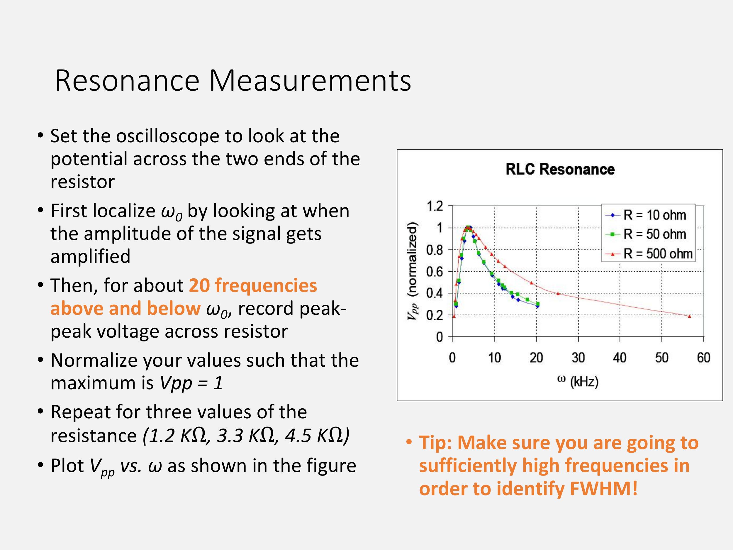 When plotting V_(pp)V_{p p} vs omega\omega remember to take enough data to measure the FWHM. When RR is large, the peak is very broad (especially towards higher frequencies). Keep taking data until you pass half height.