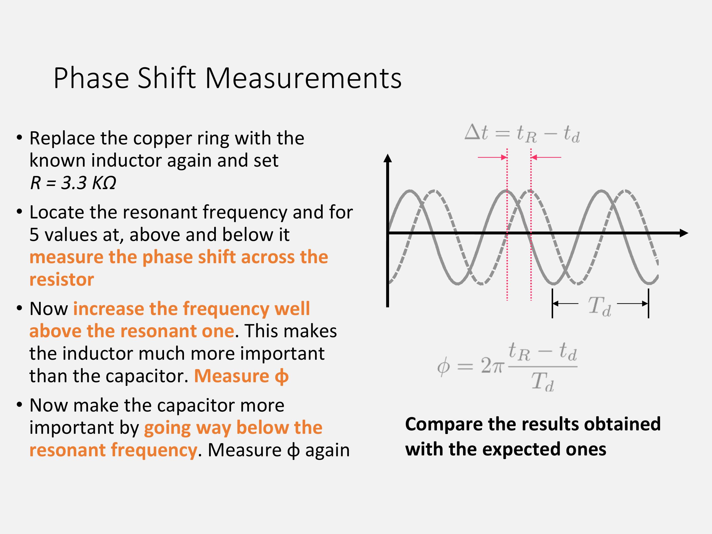 Locate the resonant frequency and for 5 values at, above and below it measure the phase shift across the resistor