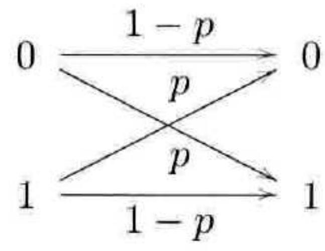 图 10-1 二元对称信道 这种解码方式叫多数者投票,因为我们根据信道输出的多数比特来确定真正传递的比特。如果有两个或者多个比特被信道翻转,则多数者投票方案将会失败,否则就可以成功解码。但两个或者多个比特被翻转的概率是 $3 p^{2}(1-p)+p^{3}$ ,所以失败的概率是 $p_{\mathrm{e}}=3 p^{2}-2 p^{3}$ 。因为如果不进行编码,发生错误的概率是 $p$ ,则只要 $p_{\mathrm{e}} < p$ ,上述编码会让信息传递更可靠,实际上只要 $p < 1 / 2$ ,这个关系都将成立。