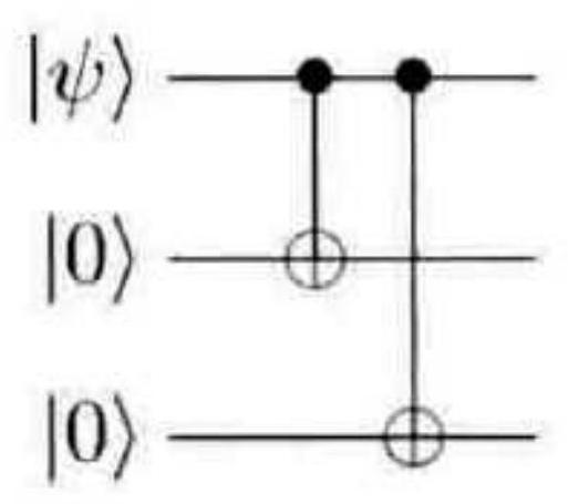 图 10-2 三量子比特的比特翻转纠错码的编码电路 习题 10.1 验证图 10-2 中的编码电路与预期的功能一致。