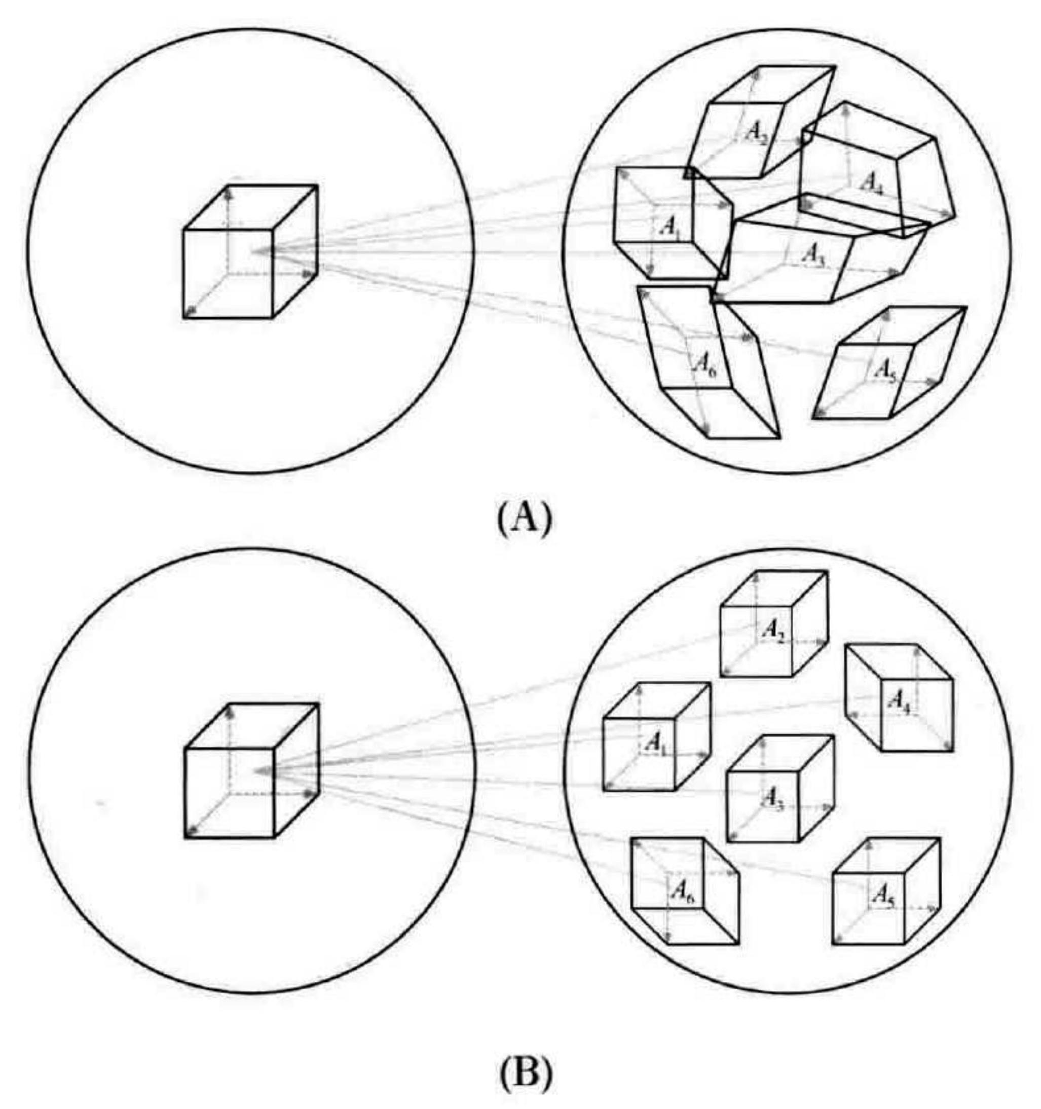 图 10-5 量子编码中希尔伯特空间的填充:(A)坏的编码,编码形成的子空间扭曲,且不互相正交;(B)好的编码,子空间没有变形且互相正交(因此可互相分辨)