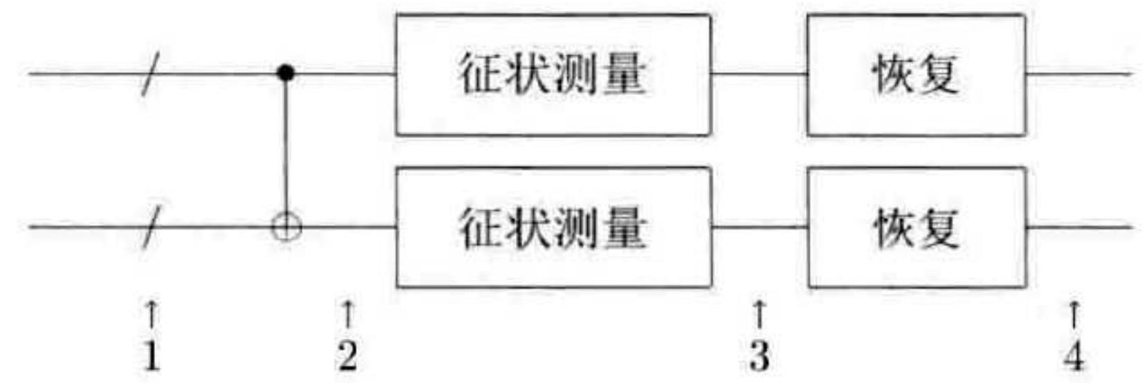 4.在受控非门执行阶段和征状测量中各发生一个错误。在输出中发生两个或多个错误的唯一可能是征状测量给出错误结果,其发生的概率是 $c_{3} p^{2}$ ,这里 $c_{3}$ 是一个常数(对 Steane 编码来说 $c_{3} \approx 10^{2}$ )。另外一种有意思,但其实无关紧要的情况是征状测量给出正确结果,此时受控非门引人的错误被正确诊断及纠正,因此输出中只剩下征状测量中引人的错误。