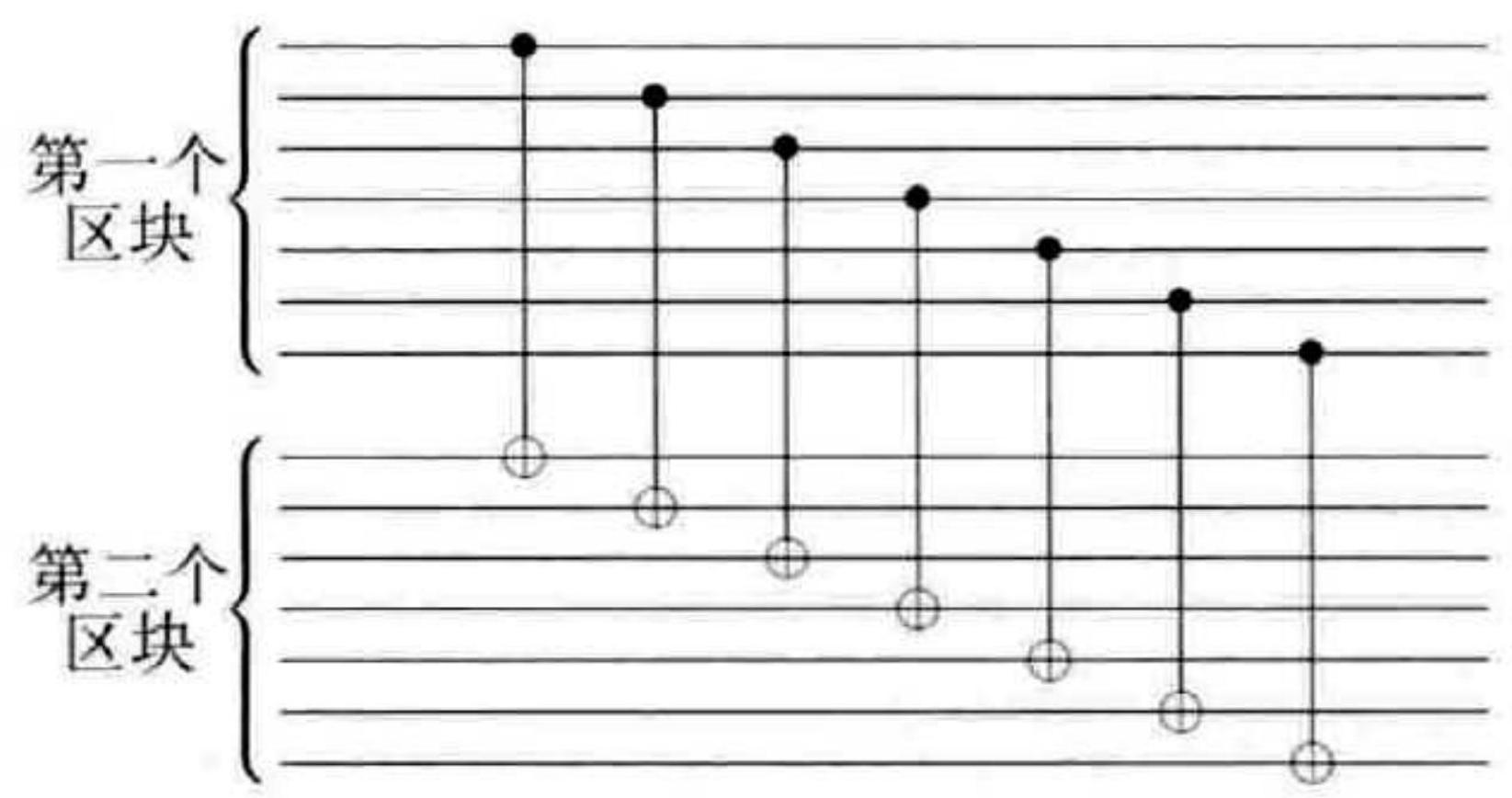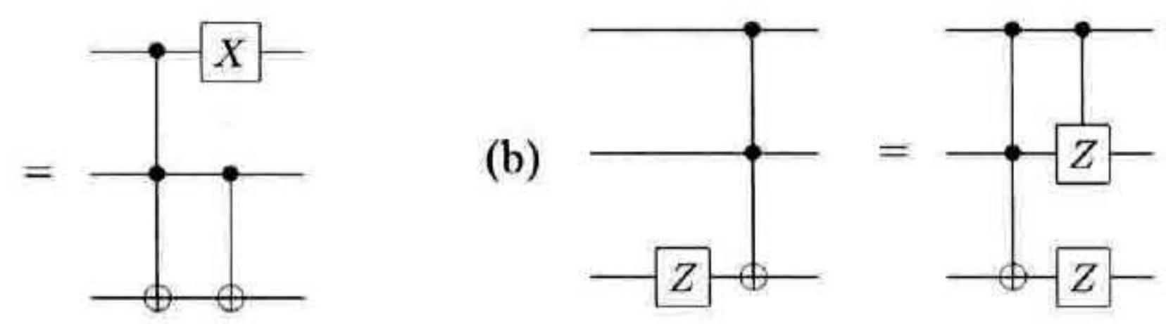 更精确地说,假设在涉及每个区块第一个量子比特(我们将它们标记为量子比特 1 和 8 )的受控非门作用之前,第一个量子比特发生一个 $X$ 错误。假设受控非门被记作 $U$ ,则整体的等价操作为 $U X_{1}=U X_{1} U^{\dagger} U=X_{1} X_{8} U$ ,也就是说,整体效果如同首先完美作用一个受控非门,随后两个区块的首个量子比特均被作用一个 $X$ 门。再稍微麻烦一些的状况是,假设某个受控非门失败