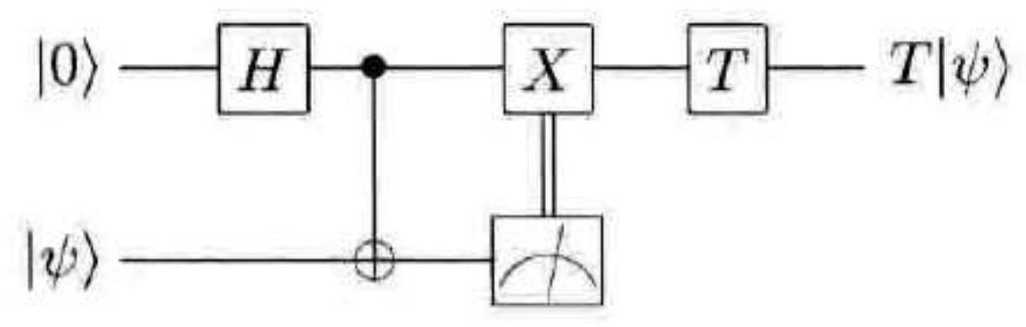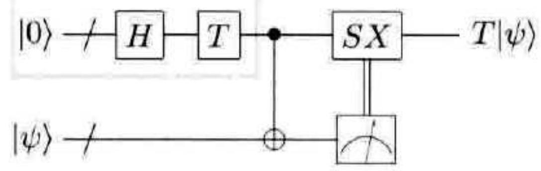 不论结果如何,我们将得到量子态 $a|0\rangle+b \exp (\mathrm{i} \pi / 4)|1\rangle$ ,最多相差一个无关的全局相位,这跟 $\pi / 8$ 门的要求一致。这个漂亮的结果看起来没有什么来由,其实这反映了一种系统的构造方法,见下面的习题。在习题 10.68 中,相同的构造方法也被用来实现容错的 Toffoli 门。
