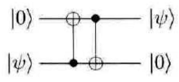 习题10.65 状态 $|\psi\rangle$ 中的一个未知量子比特,可以与制备成 $|0\rangle$ 的第二个量子比特用两个受控非门进行交换,对应的电路如下
