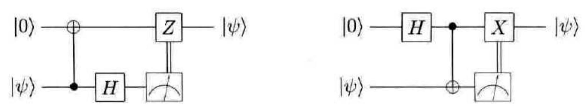 证明下面的两个电路能完成一样的功能,它们只用到一个受控非门,外加一个测量和一个经典控制的单量子比特操作。