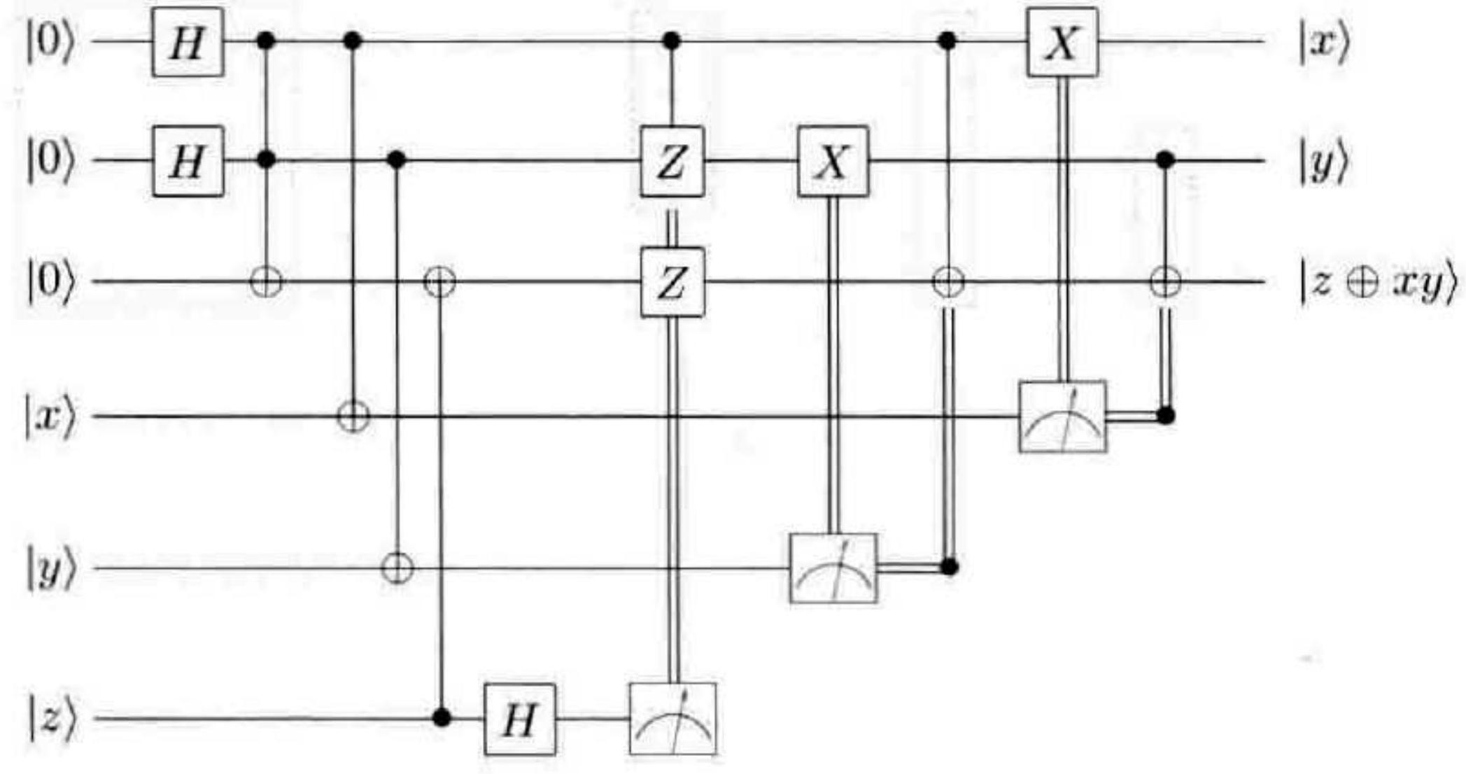 习题10.68(Toffoli 门的容错构造)基于上面关于 $\pi / 8$ 门的系列习题,稍做调整可以实现 Toffoli门的容错构造。