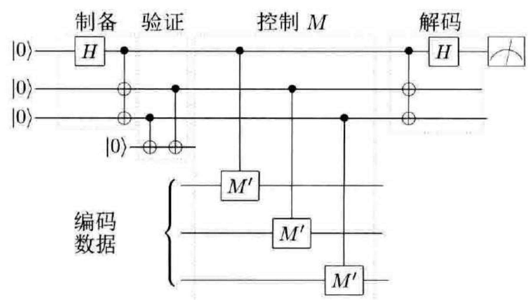 习题10.70 证明辅助态中的 $Z$ 错误不会传播到编码数据中,但会造成测量结果的错误。 在猫态被验证之后,受控 $M^{\prime}$ 门就被作用在辅助量子态和数据量子态构成的量子比特对之间,并且每个辅助量子比特将只被使用一次。因此,如果辅助量子态是 $|00 \cdots 0\rangle$ ,编码数据将保持不变,但如果辅助量子态是 $|11 \cdots 1\rangle$ ,则编码 $M$ 算子将被作用在数据上。猫态的价值在于它保证错误不会从一个受控 $M^{\prime}$ 门传播到另一个,所以状态验证阶段或作用受控 $M^{\prime}$ 门期间的单个错误,只会造成编码数据中的至多单个错误。最后,测量结果将由通过一系列受控非门和 $H$ 门解码得到,而输出量子比特的值是 0 还是 1 将取决于数据状态的特征值。这些最后阶段的逻辑门并不涉及数据,所以这些逻辑门中的错误不会传播到数据中。但如果最后阶段逻辑门中的错误给出错误的测量结果会怎么样呢?通过重复测量 3 次,并取多数结果作为输出,我们可以确保测量结果发生错误的概率是 $O\left(p^{2}\right)$ ,这里 $p$ 是单个组成部分发生错误的概率。