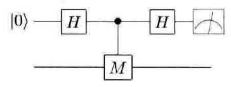 图 10-26 测量特征值为 $\pm 1$ 的单量子比特算子 $M$ 的量子电路。上面的量子比特是测量需要的辅助态,下面是被测量的数据量子比特