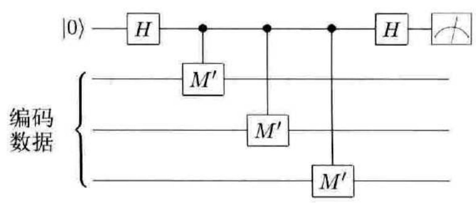 图 10-27 对编码可观测量 $M$ 的测量,实现方法是用横向性的方式逐位实现 $M^{\prime}$ 测量。此电路并不容错,注意真正的编码将需要不止 3 个量子比特