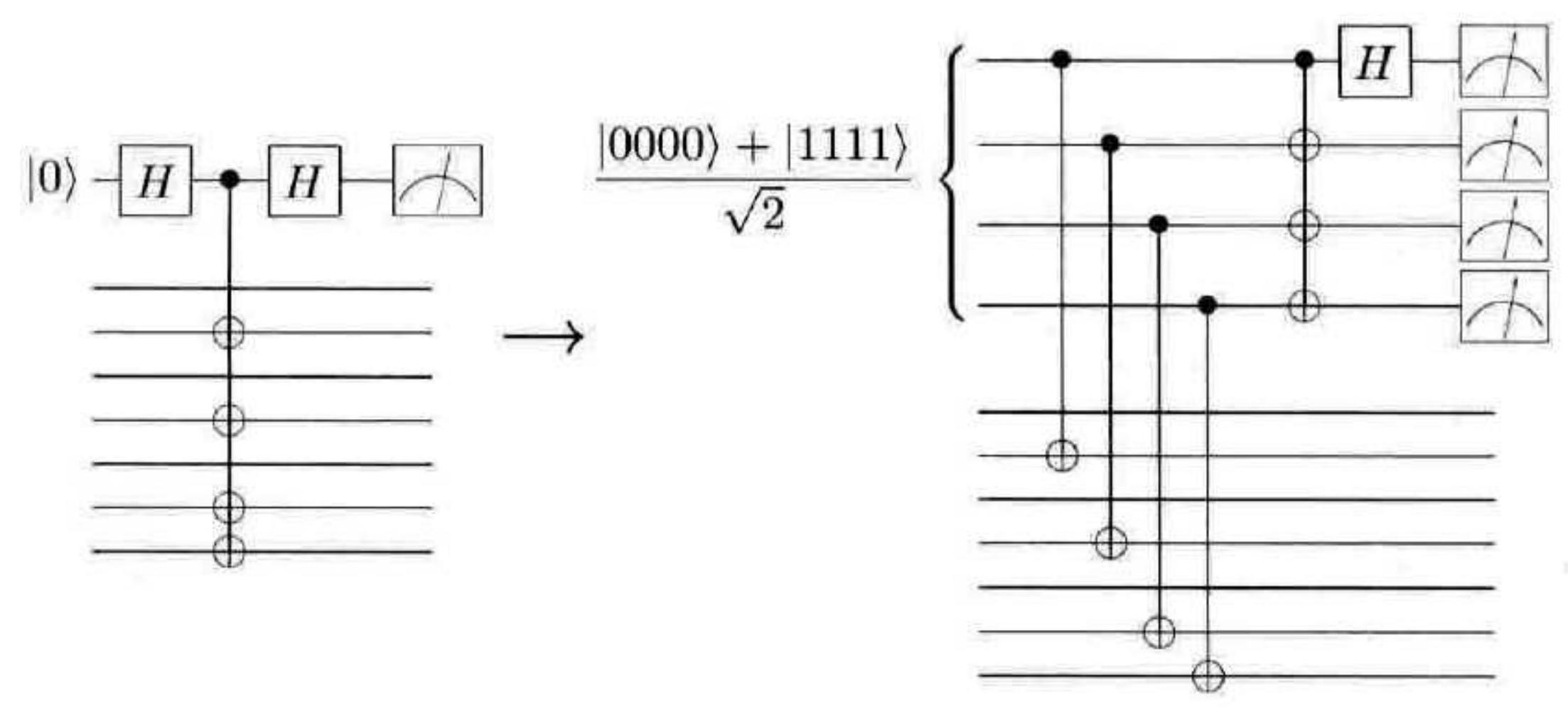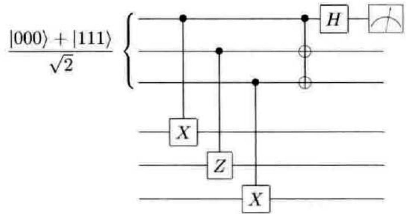 何实现容错测量,将在下一节中介绍。(严格地说,我们描述的容错测量,将有 $O\left(p^{2}\right)$ 的概率给出错误结果,这里 $p$ 是单个组成部分的错误率。在目前的讨论中,我们将忽略这个因素,其实使用稍微复杂一点的类似分析,处理这个因素也并不困难。)