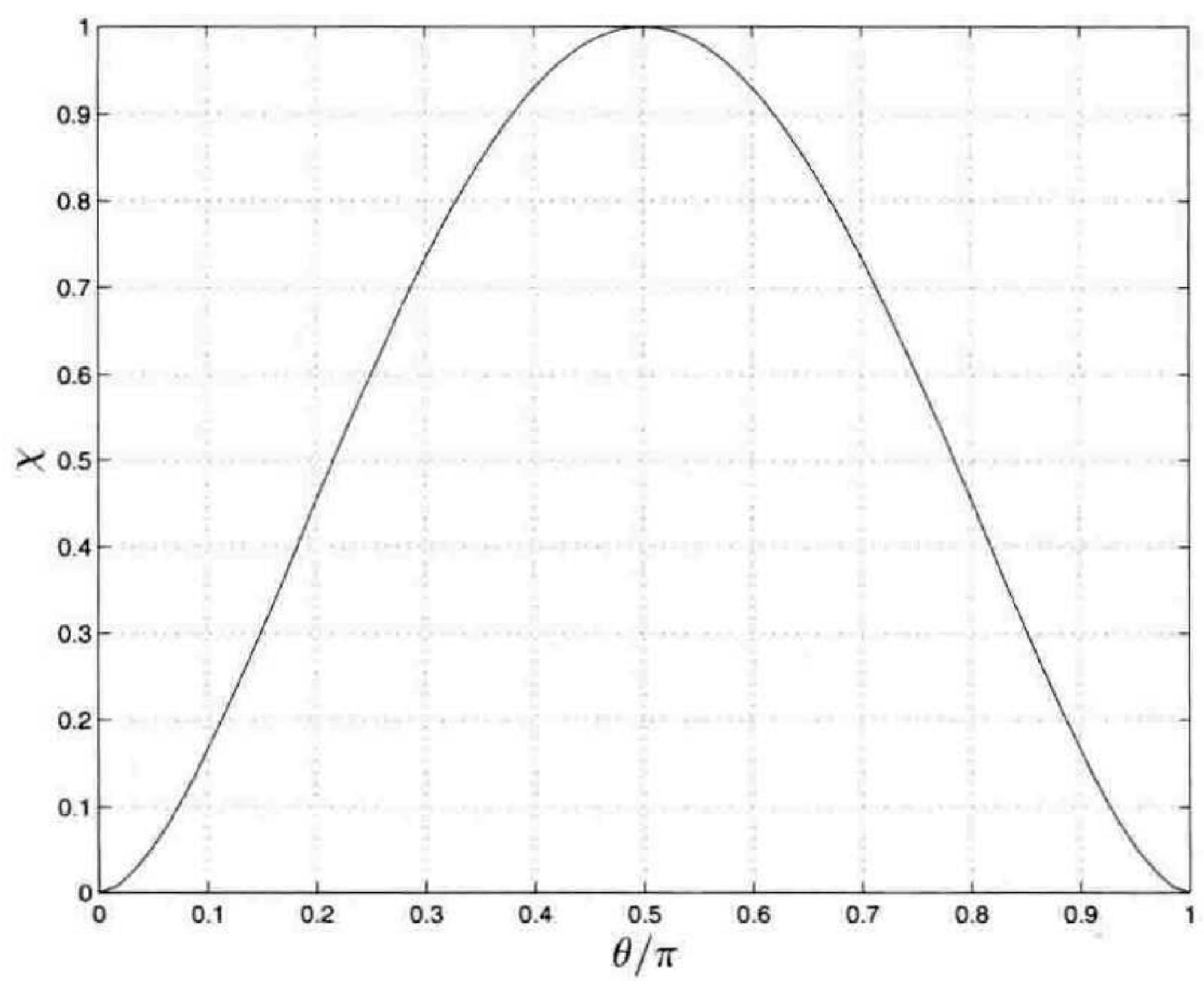 图 12-1 当以相等的概率制备态 $|0\rangle$ 和 $\cos \theta|0\rangle+\sin \theta|1\rangle$ 时,霍列沃界 $\chi$ 关于 $\theta$ 的函数图像。注意到霍列沃界当 $\theta=\pi / 2$ 时达到最大值,其对应于正交态。只有在这一点上,Bob 才有可能准确地确定 Alice制备了哪个态