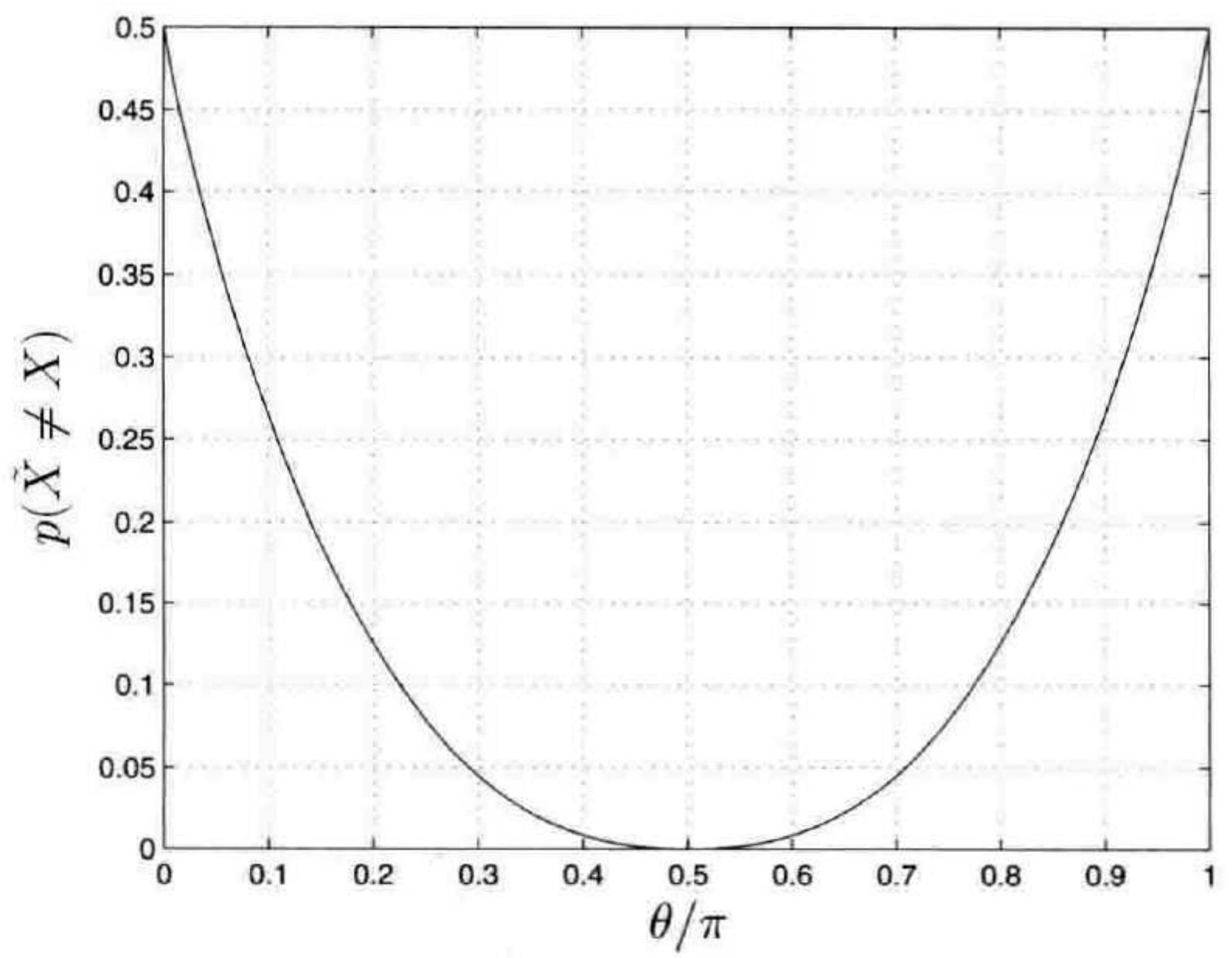 一个简单的计算表明 $\rho$ 的特征值为 $(1 \pm \cos \theta) / 2$ ,因此霍列沃界由二元嫡 $H((1+\cos \theta) / 2)$ 给出,如图 12-1 所示。注意霍列沃界当 $\theta=\pi / 2$ 时达到最大值 1 比特,其对应于 Alice 所制备的态从正交集中选择的情况,此时 Bob 可以确定 Alice 制备了哪个态。对于 $\theta$ 的其他值,霍列沃界严格小于 1 比特,Bob 无法确定 Alice 制备了哪个态。
