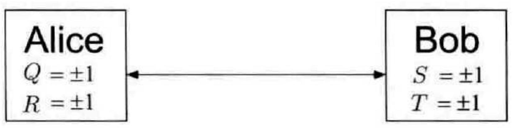 因为 $R, Q= \pm 1$ ,所以要么 $(Q+R) S=0$ ,要么 $(R-Q) T=0$ 。从式 $(2.219)$ 容易看出,对每种情况,有 $Q S+R S+R T-Q T= \pm 2$ 。下面假设测量前处于状态 $Q=q, R=r, S=s, T=t$ 的概率是 $p(q, r, s, t)$ 。这些概率可能依赖于 Charlie 如何进行制备,以及实验噪声。令 $\mathbb{E}(\cdot)$ 表示量的均值,我们有