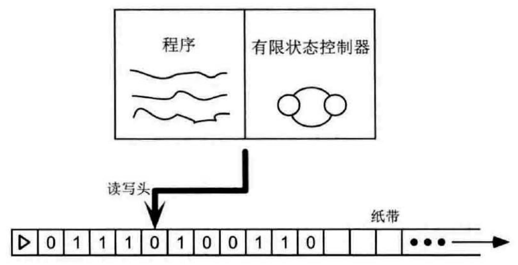 图灵机的基本要素如图 3-1 所示。图灵机包含四个主要元素:(a)程序,这十分像普通的计算机;(b)有限状态控制器,其作用类似于精简的微处理器,协调机器的其他运算;(c)纸带,其作用类似于计算机内存;(d)读写头,指向带上当前可读或可写的位置。我们现在更详细地描述这四个元素中的每一个。