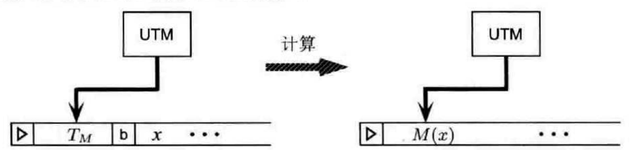 通用图灵机(见下图)具有以下特性。设 $M$ 为任意的图灵机,令 $T_{M}$ 为与机器 $M$ 关联的图灵编号。然后在如下输入上:$T_{M}$ 的二进制表示后跟着一个空白符,而后在纸带的其余部分上跟着任意的字符串 $x$ ,通用图灵机给出机器 $M$ 在输入 $x$ 上的输出作为它的输出。因此,通用图灵机能够模拟任何其他的图灵机!