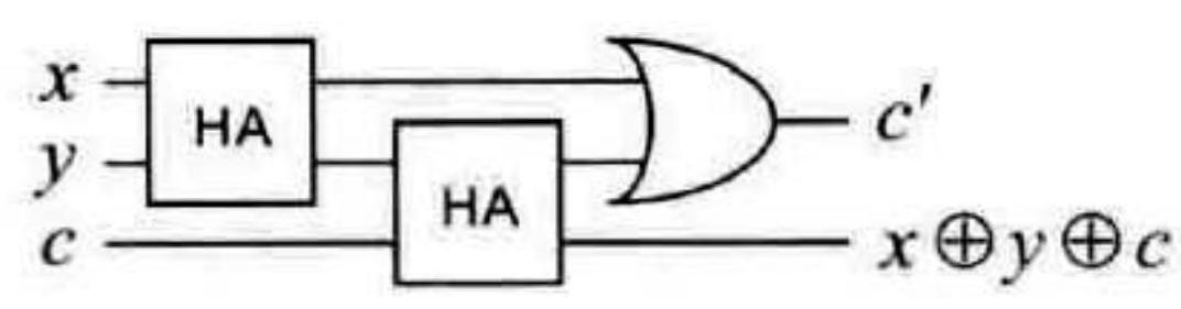 可以使用两个级联的半加法器来构造一个全加法器,如图 3-6 所示。全加法器把三个比特 $x, y$ 和 $c$ 作为输人。比特 $x$ 和 $y$ 应该看做是要相加的数据,而 $c$ 则来自较早计算的进位。电路输出两个比特。一个输出比特是所有三个输人比特的模 2 加和 $x \oplus y \oplus c$ ,第二个输出比特 $c^{\prime}$ 是进位,如果两个或多个输入为 1 ,那么它设置为 1 ,否则为 0 。