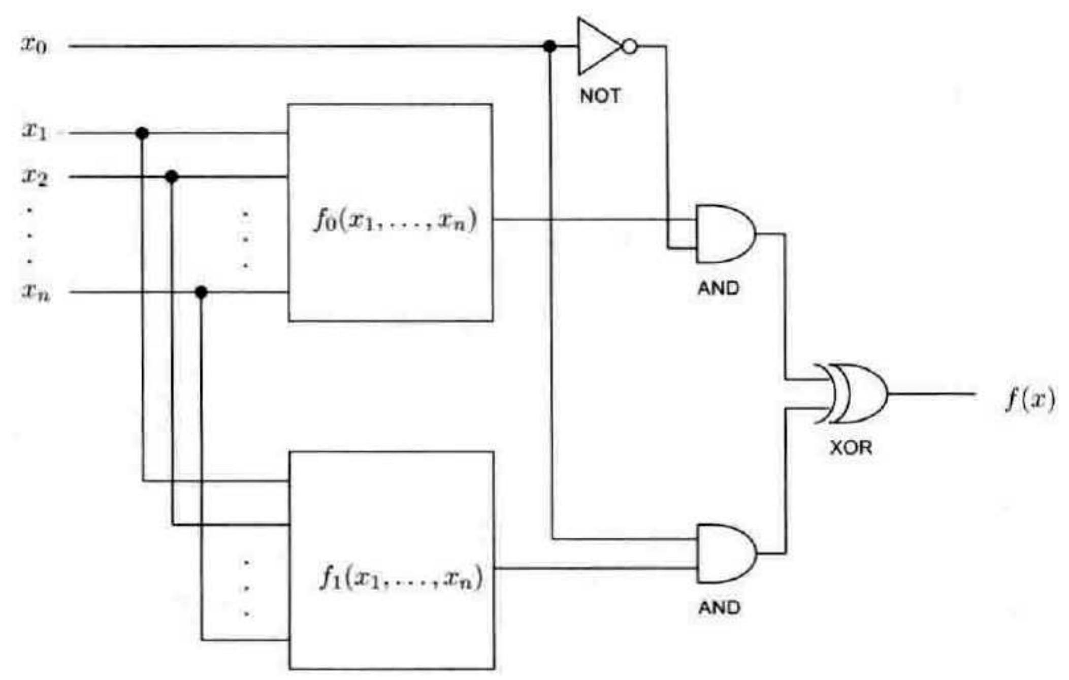 现在设计一个计算 $f$ 的电路成了一件容易的事。该电路在最后 $n$ 比特的输人上计算 $f_{0}$ 和 $f_{1}$ 。然后,它根据输人的第一个比特是 0 还是 1 来输出合适的答案。一个执行此操作的电路如图 3-8所示。这完成了归纳。